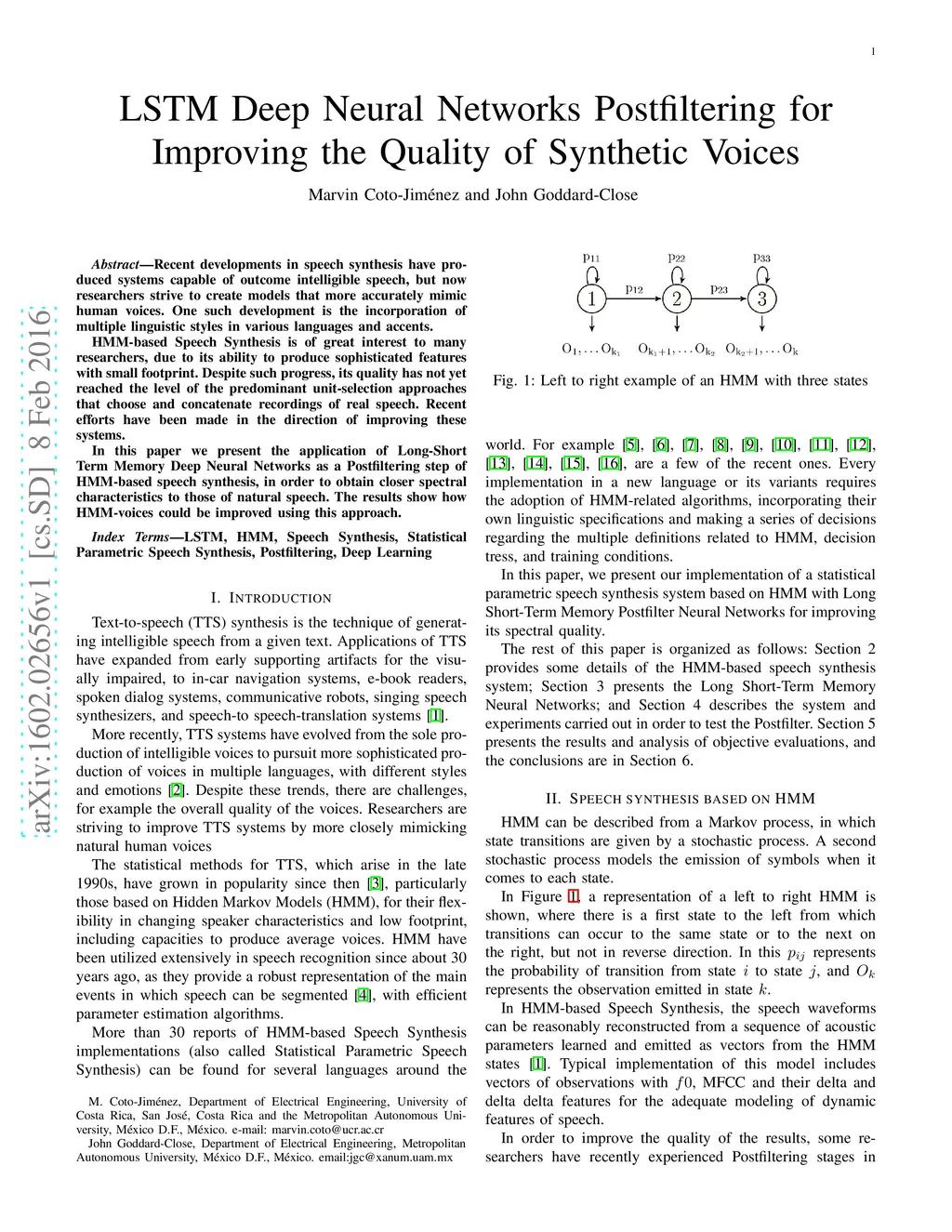 Recent developments in speech synthesis have produced systems capable of outcome intelligible speech, but now researchers strive to create models that more accurately mimic human voices. One such development is the incorporation of multiple linguistic styles in various languages and accents. HMM-based Speech Synthesis is of great interest to many researchers, due to its ability to produce sophisticated features with small footprint. Despite such progress, its quality has not yet reached the level of the predominant unit-selection approaches that choose and concatenate recordings of real speech. Recent efforts have been made in the direction of improving these systems. In this paper we present the application of Long-Short Term Memory Deep Neural Networks as a Postfiltering step of HMM-based speech synthesis, in order to obtain closer spectral characteristics to those of natural speech. The results show how HMM-voices could be improved using this approach.