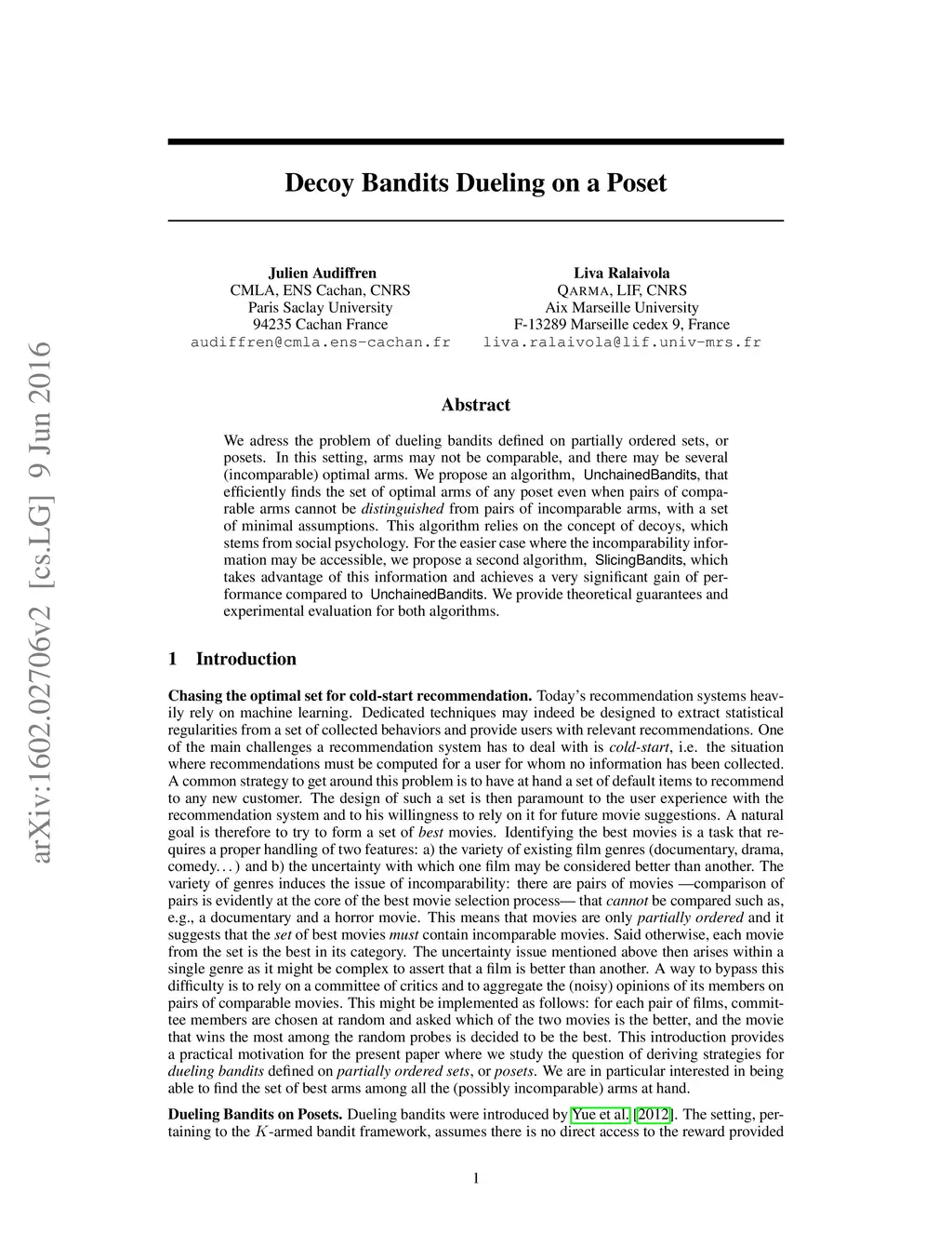 We adress the problem of dueling bandits defined on partially ordered sets, or posets. In this setting, arms may not be comparable, and there may be several (incomparable) optimal arms. We propose an algorithm, UnchainedBandits, that efficiently finds the set of optimal arms of any poset even when pairs of comparable arms cannot be distinguished from pairs of incomparable arms, with a set of minimal assumptions. This algorithm relies on the concept of decoys, which stems from social psychology. For the easier case where the incomparability information may be accessible, we propose a second algorithm, SlicingBandits, which takes advantage of this information and achieves a very significant gain of performance compared to UnchainedBandits. We provide theoretical guarantees and experimental evaluation for both algorithms.