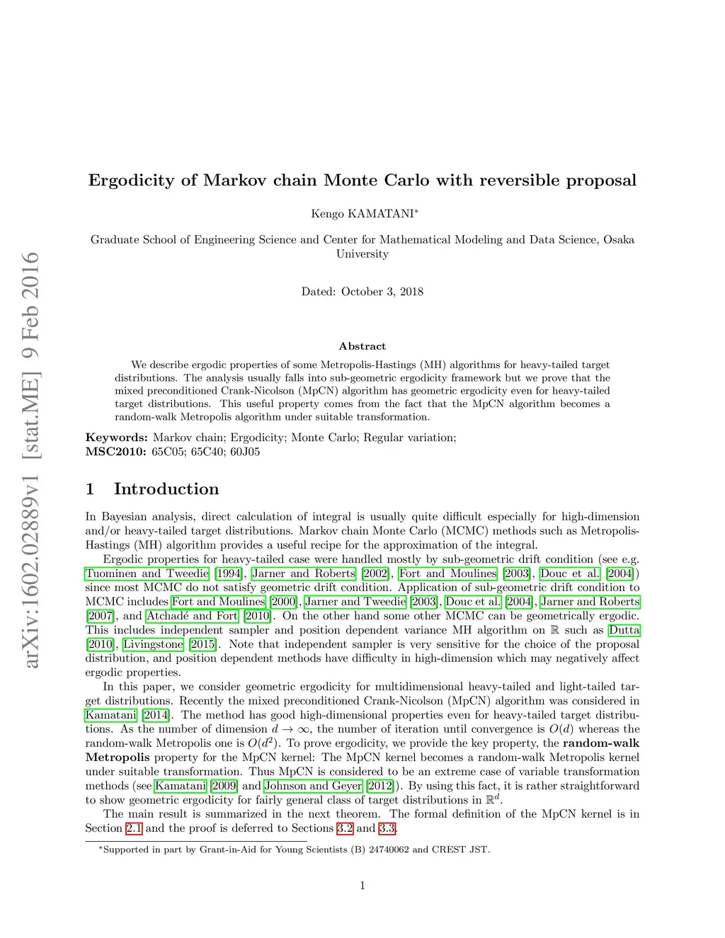 Ergodicity of Markov chain Monte Carlo with reversible proposal