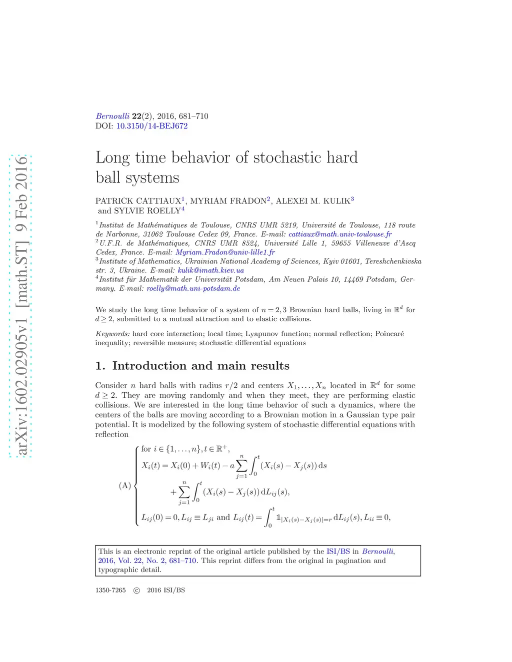 We study the long time behavior of a system of Brownian hard balls, living in for , submitted to a mutual attraction and to elastic collisions.