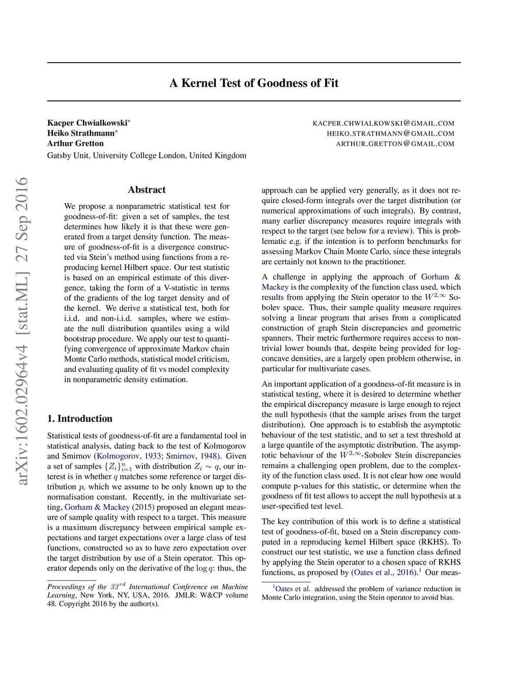 We propose a nonparametric statistical test for goodness-of-fit: given a set of samples, the test determines how likely it is that these were generated from a target density function. The measure of goodness-of-fit is a divergence constructed via Stein's method using functions from a Reproducing Kernel Hilbert Space. Our test statistic is based on an empirical estimate of this divergence, taking the form of a V-statistic in terms of the log gradients of the target density and the kernel. We derive a statistical test, both for i.i.d. and non-i.i.d. samples, where we estimate the null distribution quantiles using a wild bootstrap procedure. We apply our test to quantifying convergence of approximate Markov Chain Monte Carlo methods, statistical model criticism, and evaluating quality of fit vs model complexity in nonparametric density estimation.