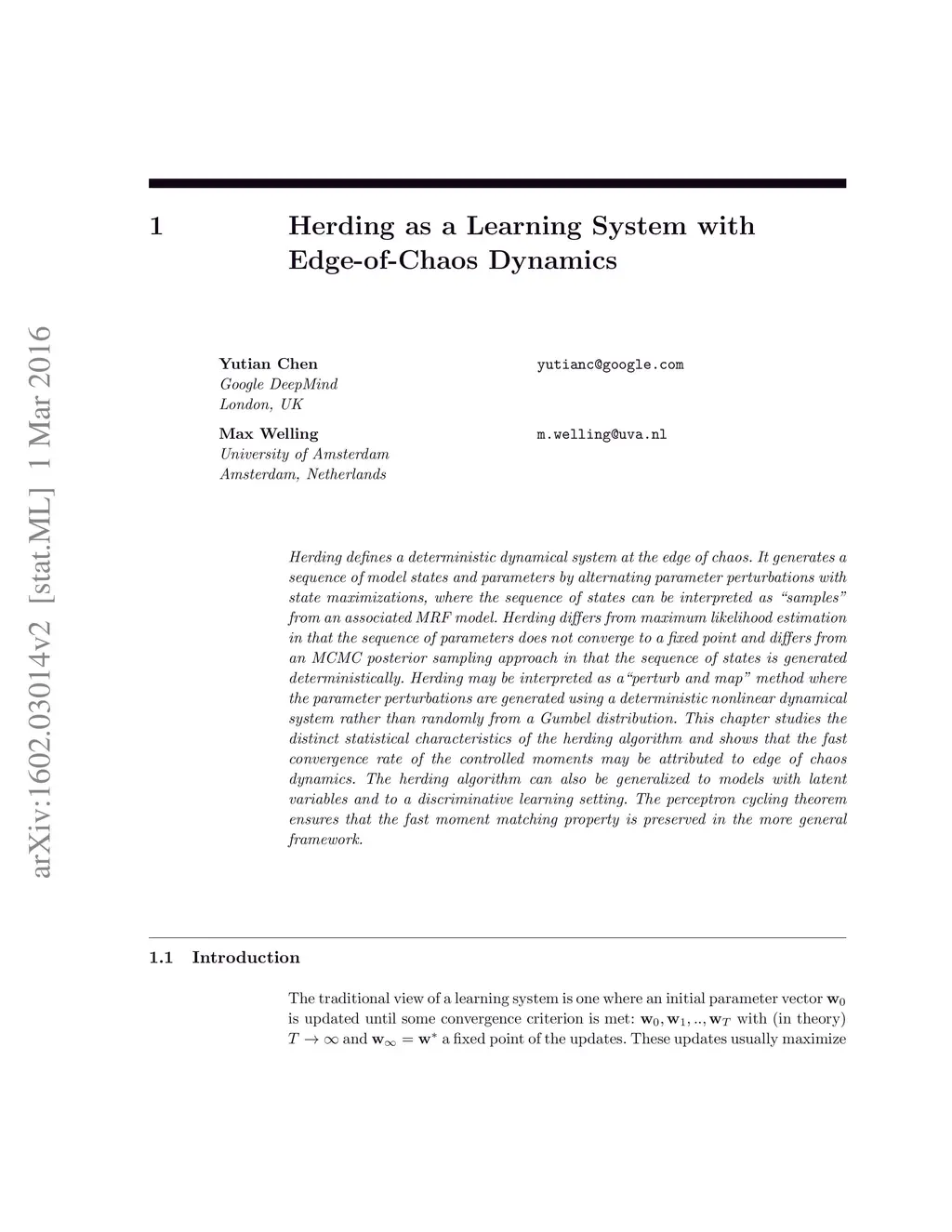 Herding defines a deterministic dynamical system at the edge of chaos. It generates a sequence of model states and parameters by alternating parameter perturbations with state maximizations, where the sequence of states can be interpreted as "samples" from an associated MRF model. Herding differs from maximum likelihood estimation in that the sequence of parameters does not converge to a fixed point and differs from an MCMC posterior sampling approach in that the sequence of states is generated deterministically. Herding may be interpreted as a"perturb and map" method where the parameter perturbations are generated using a deterministic nonlinear dynamical system rather than randomly from a Gumbel distribution. This chapter studies the distinct statistical characteristics of the herding algorithm and shows that the fast convergence rate of the controlled moments may be attributed to edge of chaos dynamics. The herding algorithm can also be generalized to models with latent variables and to a discriminative learning setting. The perceptron cycling theorem ensures that the fast moment matching property is preserved in the more general framework.
