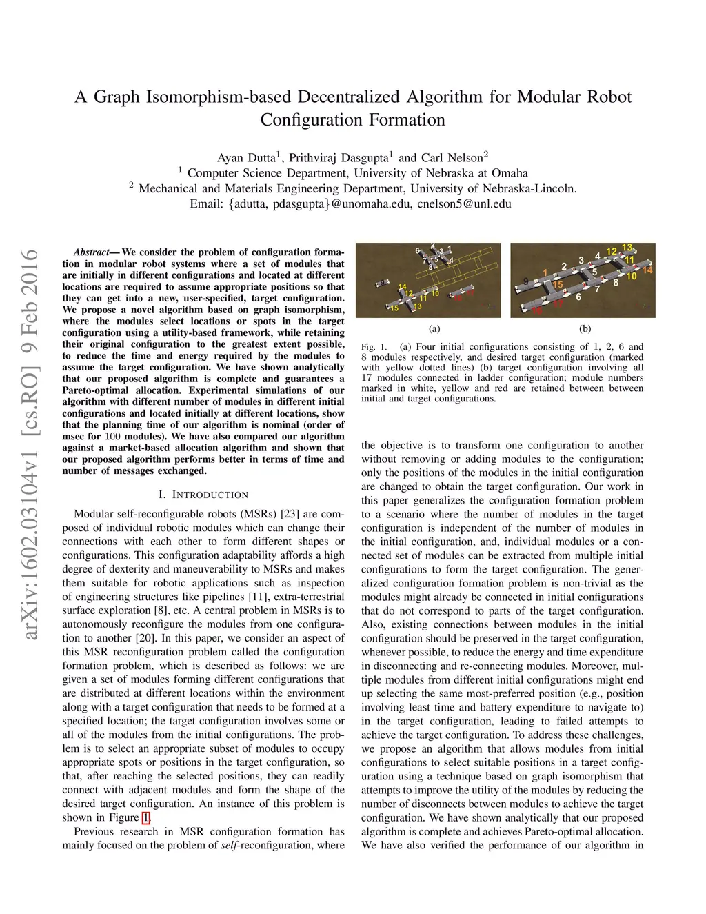 We consider the problem of configuration formation in modular robot systems where a set of modules that are initially in different configurations and located at different locations are required to assume appropriate positions so that they can get into a new, user-specified, target configuration. We propose a novel algorithm based on graph isomorphism, where the modules select locations or spots in the target configuration using a utility-based framework, while retaining their original configuration to the greatest extent possible, to reduce the time and energy required by the modules to assume the target configuration. We have shown analytically that our proposed algorithm is complete and guarantees a Pareto-optimal allocation. Experimental simulations of our algorithm with different number of modules in different initial configurations and located initially at different locations, show that the planning time of our algorithm is nominal (order of msec. for 100 modules). We have also compared our algorithm against a market-based allocation algorithm and shown that our proposed algorithm performs better in terms of time and number of messages exchanged.