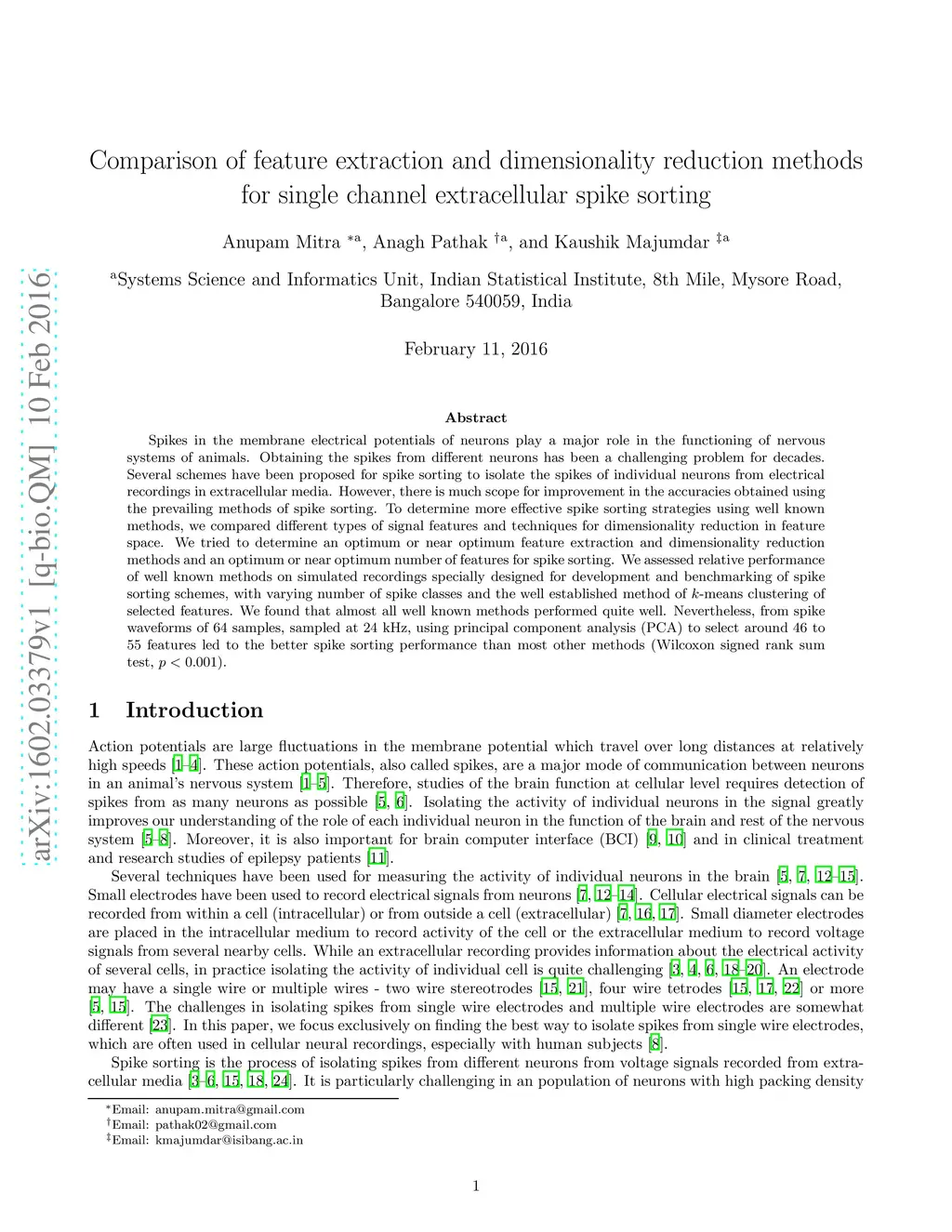 Spikes in the membrane electrical potentials of neurons play a major role in the functioning of nervous systems of animals. Obtaining the spikes from different neurons has been a challenging problem for decades. Several schemes have been proposed for spike sorting to isolate the spikes of individual neurons from electrical recordings in extracellular media. However, there is much scope for improvement in the accuracies obtained using the prevailing methods of spike sorting. To determine more effective spike sorting strategies using well known methods, we compared different types of signal features and techniques for dimensionality reduction in feature space. We tried to determine an optimum or near optimum feature extraction and dimensionality reduction methods and an optimum or near optimum number of features for spike sorting. We assessed relative performance of well known methods on simulated recordings specially designed for development and benchmarking of spike sorting schemes, with varying number of spike classes and the well established method of -means clustering of selected features. We found that almost all well known methods performed quite well. Nevertheless, from spike waveforms of 64 samples, sampled at 24 kHz, using principal component analysis (PCA) to select around 46 to 55 features led to the better spike sorting performance than most other methods (Wilcoxon signed rank sum test, ).
