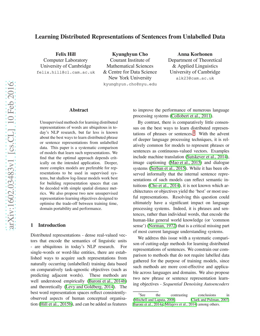 Learning Distributed Representations of Sentences from Unlabelled Data
