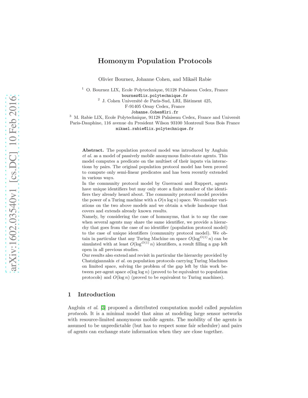 The population protocol model was introduced by Angluin \emph{et al.} as a model of passively mobile anonymous finite-state agents. This model computes a predicate on the multiset of their inputs via interactions by pairs. The original population protocol model has been proved to compute only semi-linear predicates and has been recently extended in various ways. In the community protocol model by Guerraoui and Ruppert, agents have unique identifiers but may only store a finite number of the identifiers they already heard about. The community protocol model provides the power of a Turing machine with a space. We consider variations on the two above models and we obtain a whole landscape that covers and extends already known results. Namely, by considering the case of homonyms, that is to say the case when several agents may share the same identifier, we provide a hierarchy that goes from the case of no identifier (population protocol model) to the case of unique identifiers (community protocol model). We obtain in particular that any Turing Machine on space can be simulated with at least identifiers, a result filling a gap left open in all previous studies. Our results also extend and revisit in particular the hierarchy provided by Chatzigiannakis \emph{et al.} on population protocols carrying Turing Machines on limited space, solving the problem of the gap left by this work between per-agent space (proved to be equivalent to population protocols) and (proved to be equivalent to Turing machines).