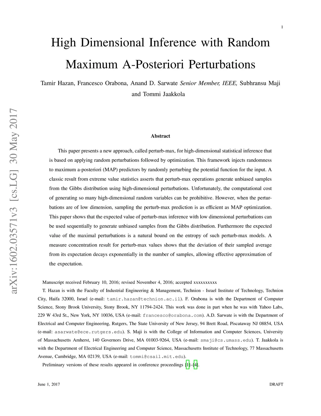 This paper presents a new approach, called perturb-max, for high-dimensional statistical inference that is based on applying random perturbations followed by optimization. This framework injects randomness to maximum a-posteriori (MAP) predictors by randomly perturbing the potential function for the input. A classic result from extreme value statistics asserts that perturb-max operations generate unbiased samples from the Gibbs distribution using high-dimensional perturbations. Unfortunately, the computational cost of generating so many high-dimensional random variables can be prohibitive. However, when the perturbations are of low dimension, sampling the perturb-max prediction is as efficient as MAP optimization. This paper shows that the expected value of perturb-max inference with low dimensional perturbations can be used sequentially to generate unbiased samples from the Gibbs distribution. Furthermore the expected value of the maximal perturbations is a natural bound on the entropy of such perturb-max models. A measure concentration result for perturb-max values shows that the deviation of their sampled average from its expectation decays exponentially in the number of samples, allowing effective approximation of the expectation.