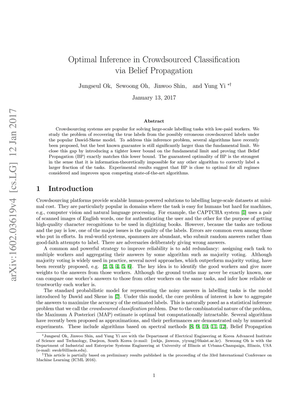Optimal Inference in Crowdsourced Classification via Belief Propagation