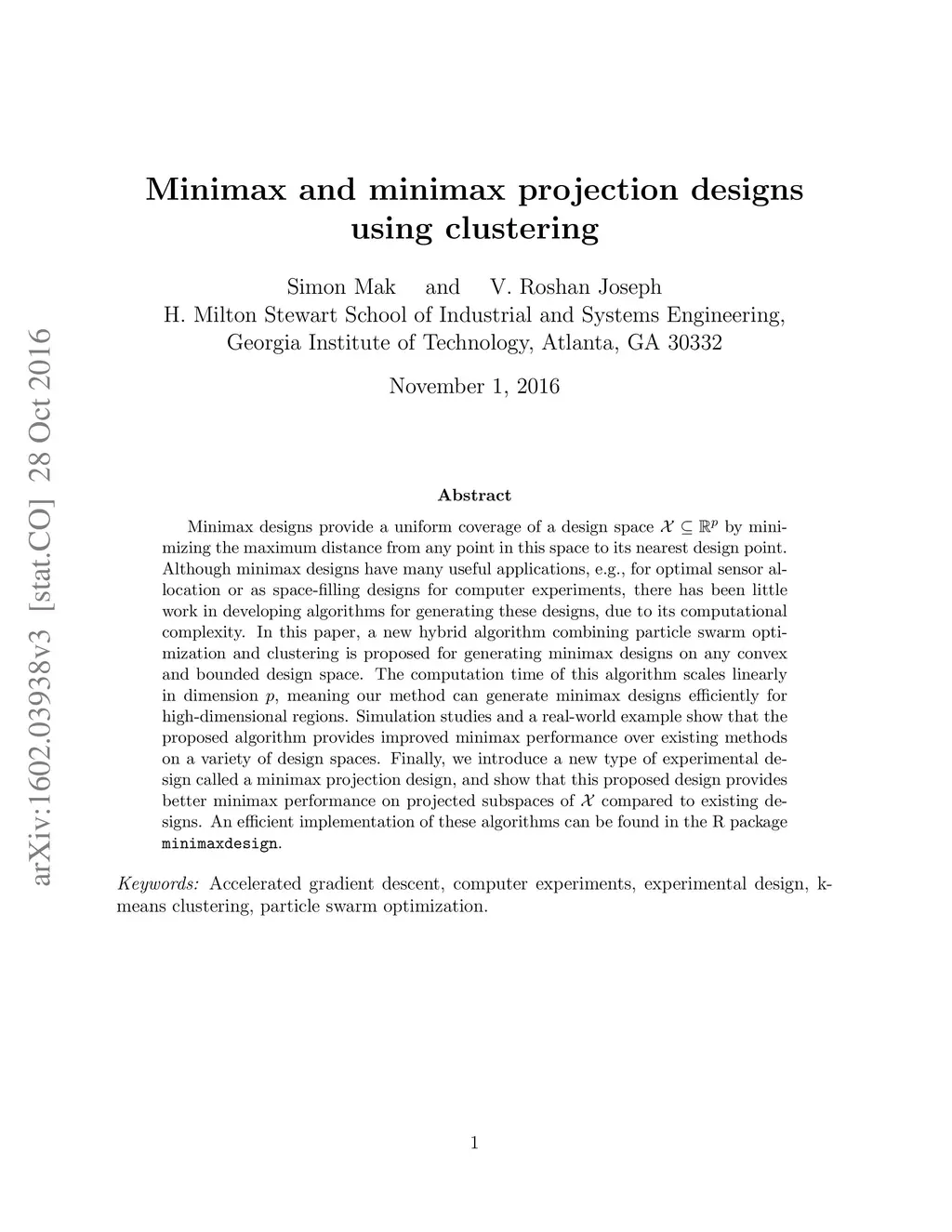Minimax designs provide a uniform coverage of a design space by minimizing the maximum distance from any point in this space to its nearest design point. Although minimax designs have many useful applications, e.g., for optimal sensor allocation or as space-filling designs for computer experiments, there has been little work in developing algorithms for generating these designs, due to its computational complexity. In this paper, a new hybrid algorithm combining particle swarm optimization and clustering is proposed for generating minimax designs on any convex and bounded design space. The computation time of this algorithm scales linearly in dimension , meaning our method can generate minimax designs efficiently for high-dimensional regions. Simulation studies and a real-world example show that the proposed algorithm provides improved minimax performance over existing methods on a variety of design spaces. Finally, we introduce a new type of experimental design called a minimax projection design, and show that this proposed design provides better minimax performance on projected subspaces of compared to existing designs. An efficient implementation of these algorithms can be found in the R package minimaxdesign.