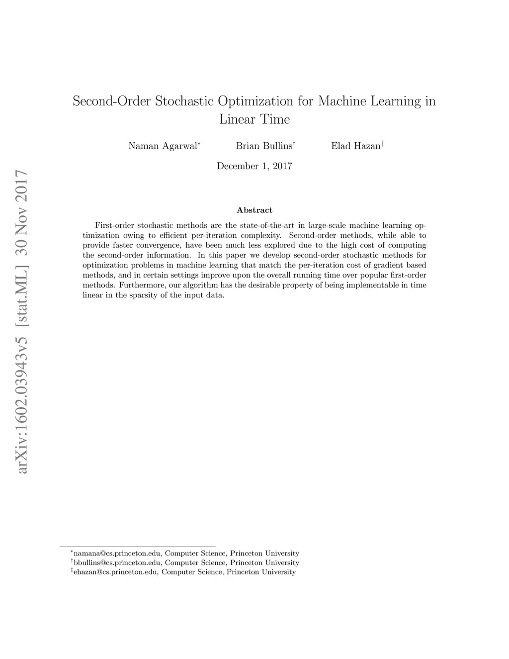 First-order stochastic methods are the state-of-the-art in large-scale machine learning optimization owing to efficient per-iteration complexity. Second-order methods, while able to provide faster convergence, have been much less explored due to the high cost of computing the second-order information. In this paper we develop second-order stochastic methods for optimization problems in machine learning that match the per-iteration cost of gradient based methods, and in certain settings improve upon the overall running time over popular first-order methods. Furthermore, our algorithm has the desirable property of being implementable in time linear in the sparsity of the input data.