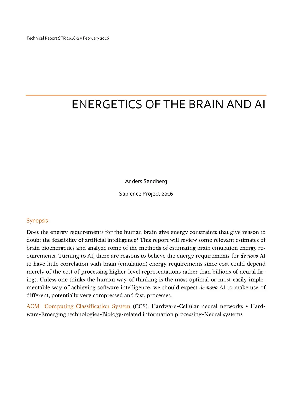 Does the energy requirements for the human brain give energy constraints that give reason to doubt the feasibility of artificial intelligence? This report will review some relevant estimates of brain bioenergetics and analyze some of the methods of estimating brain emulation energy requirements. Turning to AI, there are reasons to believe the energy requirements for de novo AI to have little correlation with brain (emulation) energy requirements since cost could depend merely of the cost of processing higher-level representations rather than billions of neural firings. Unless one thinks the human way of thinking is the most optimal or most easily implementable way of achieving software intelligence, we should expect de novo AI to make use of different, potentially very compressed and fast, processes.
