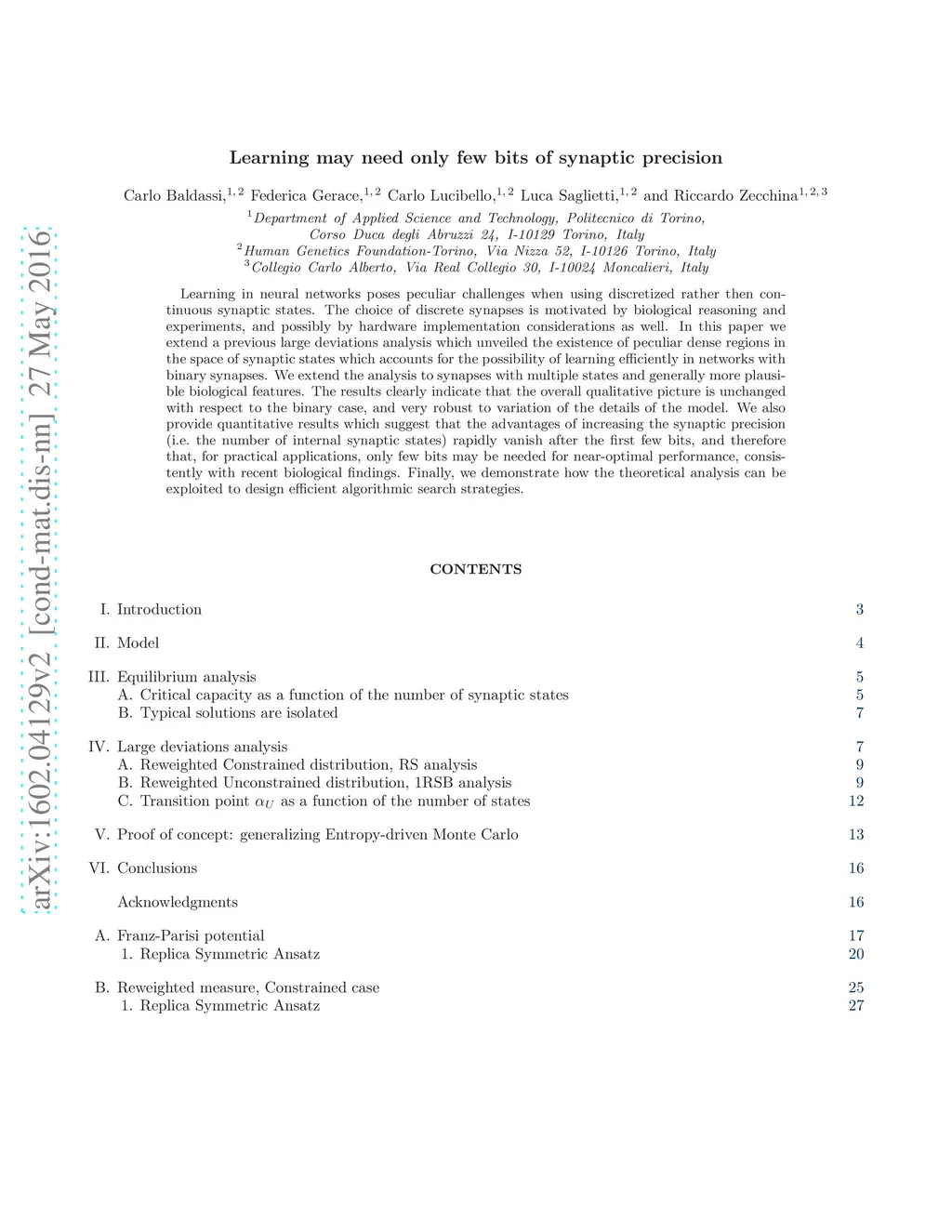 Learning in neural networks poses peculiar challenges when using discretized rather then continuous synaptic states. The choice of discrete synapses is motivated by biological reasoning and experiments, and possibly by hardware implementation considerations as well. In this paper we extend a previous large deviations analysis which unveiled the existence of peculiar dense regions in the space of synaptic states which accounts for the possibility of learning efficiently in networks with binary synapses. We extend the analysis to synapses with multiple states and generally more plausible biological features. The results clearly indicate that the overall qualitative picture is unchanged with respect to the binary case, and very robust to variation of the details of the model. We also provide quantitative results which suggest that the advantages of increasing the synaptic precision (i.e.~the number of internal synaptic states) rapidly vanish after the first few bits, and therefore that, for practical applications, only few bits may be needed for near-optimal performance, consistently with recent biological findings. Finally, we demonstrate how the theoretical analysis can be exploited to design efficient algorithmic search strategies.