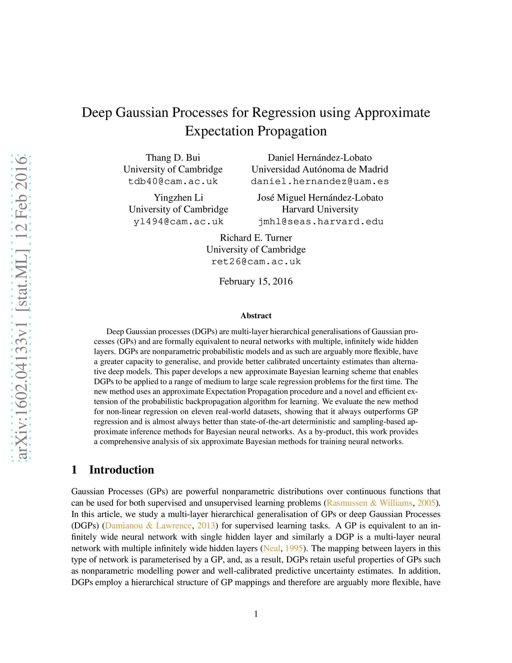 Deep Gaussian processes (DGPs) are multi-layer hierarchical generalisations of Gaussian processes (GPs) and are formally equivalent to neural networks with multiple, infinitely wide hidden layers. DGPs are nonparametric probabilistic models and as such are arguably more flexible, have a greater capacity to generalise, and provide better calibrated uncertainty estimates than alternative deep models. This paper develops a new approximate Bayesian learning scheme that enables DGPs to be applied to a range of medium to large scale regression problems for the first time. The new method uses an approximate Expectation Propagation procedure and a novel and efficient extension of the probabilistic backpropagation algorithm for learning. We evaluate the new method for non-linear regression on eleven real-world datasets, showing that it always outperforms GP regression and is almost always better than state-of-the-art deterministic and sampling-based approximate inference methods for Bayesian neural networks. As a by-product, this work provides a comprehensive analysis of six approximate Bayesian methods for training neural networks.