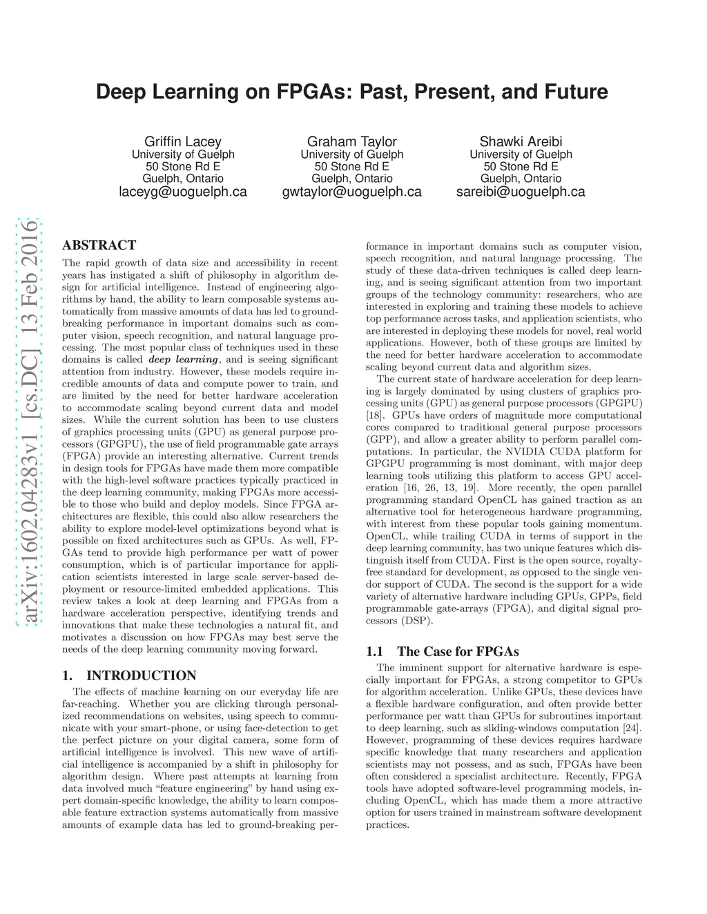 The rapid growth of data size and accessibility in recent years has instigated a shift of philosophy in algorithm design for artificial intelligence. Instead of engineering algorithms by hand, the ability to learn composable systems automatically from massive amounts of data has led to ground-breaking performance in important domains such as computer vision, speech recognition, and natural language processing. The most popular class of techniques used in these domains is called deep learning, and is seeing significant attention from industry. However, these models require incredible amounts of data and compute power to train, and are limited by the need for better hardware acceleration to accommodate scaling beyond current data and model sizes. While the current solution has been to use clusters of graphics processing units (GPU) as general purpose processors (GPGPU), the use of field programmable gate arrays (FPGA) provide an interesting alternative. Current trends in design tools for FPGAs have made them more compatible with the high-level software practices typically practiced in the deep learning community, making FPGAs more accessible to those who build and deploy models. Since FPGA architectures are flexible, this could also allow researchers the ability to explore model-level optimizations beyond what is possible on fixed architectures such as GPUs. As well, FPGAs tend to provide high performance per watt of power consumption, which is of particular importance for application scientists interested in large scale server-based deployment or resource-limited embedded applications. This review takes a look at deep learning and FPGAs from a hardware acceleration perspective, identifying trends and innovations that make these technologies a natural fit, and motivates a discussion on how FPGAs may best serve the needs of the deep learning community moving forward.