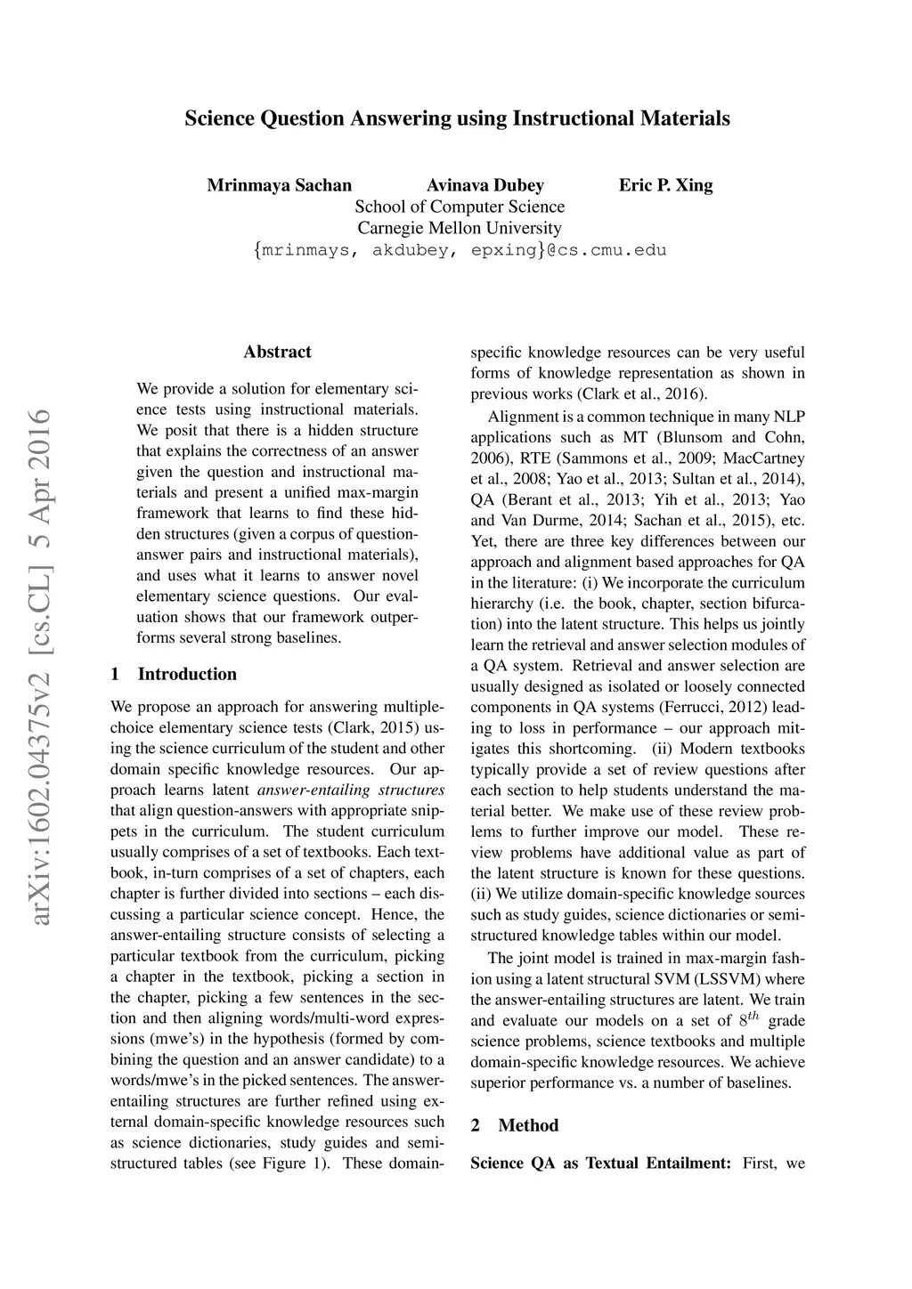 We provide a solution for elementary science test using instructional materials. We posit that there is a hidden structure that explains the correctness of an answer given the question and instructional materials and present a unified max-margin framework that learns to find these hidden structures (given a corpus of question-answer pairs and instructional materials), and uses what it learns to answer novel elementary science questions. Our evaluation shows that our framework outperforms several strong baselines.