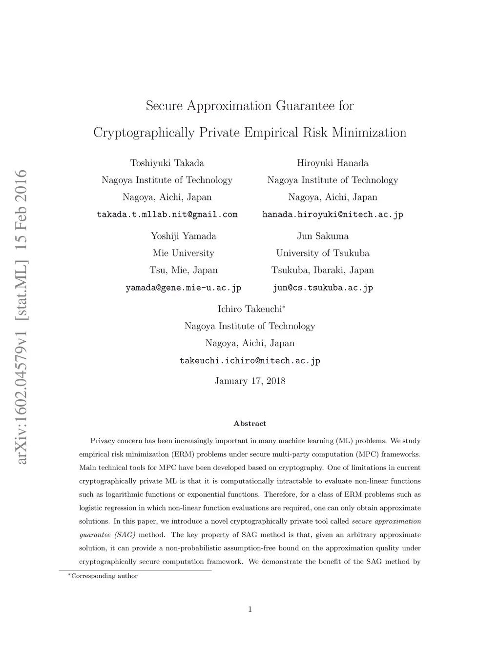 Privacy concern has been increasingly important in many machine learning (ML) problems. We study empirical risk minimization (ERM) problems under secure multi-party computation (MPC) frameworks. Main technical tools for MPC have been developed based on cryptography. One of limitations in current cryptographically private ML is that it is computationally intractable to evaluate non-linear functions such as logarithmic functions or exponential functions. Therefore, for a class of ERM problems such as logistic regression in which non-linear function evaluations are required, one can only obtain approximate solutions. In this paper, we introduce a novel cryptographically private tool called secure approximation guarantee (SAG) method. The key property of SAG method is that, given an arbitrary approximate solution, it can provide a non-probabilistic assumption-free bound on the approximation quality under cryptographically secure computation framework. We demonstrate the benefit of the SAG method by applying it to several problems including a practical privacy-preserving data analysis task on genomic and clinical information.