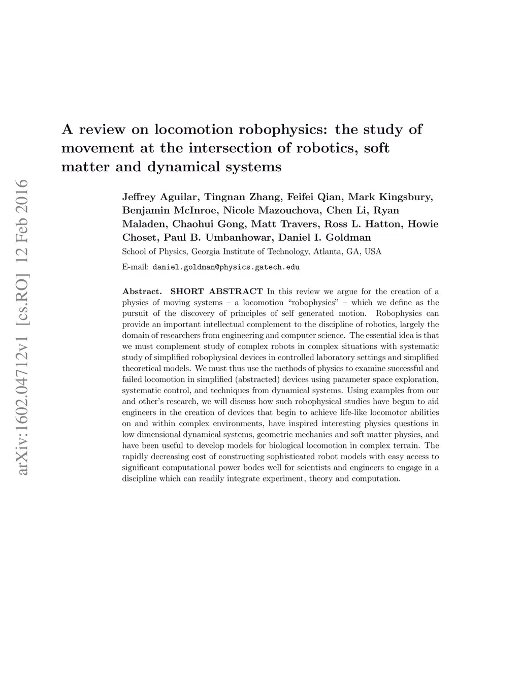 A review on locomotion robophysics: the study of movement at the