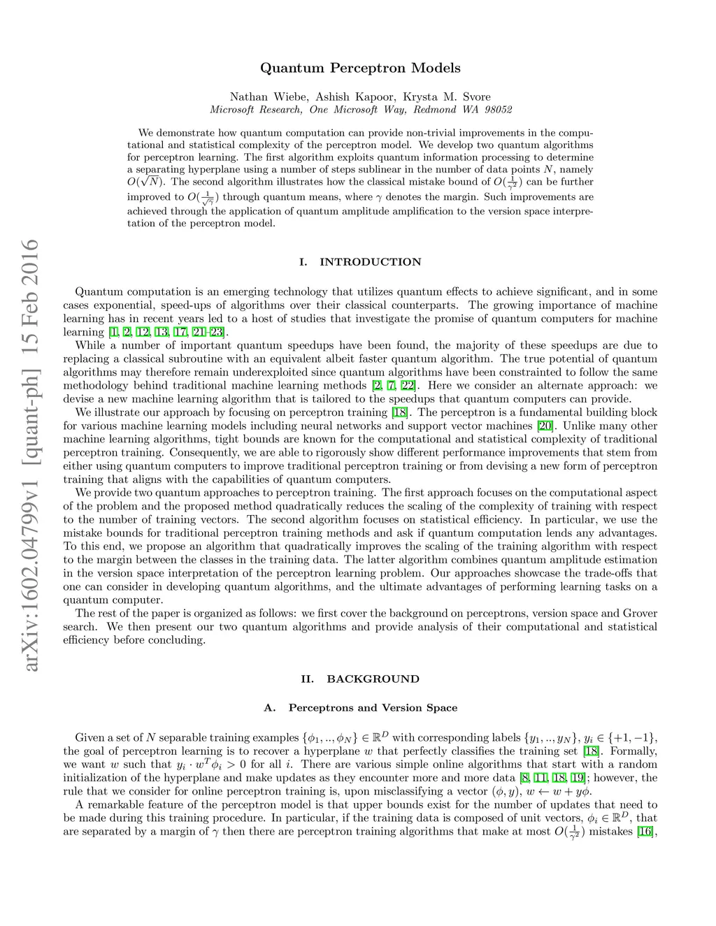 We demonstrate how quantum computation can provide non-trivial improvements in the computational and statistical complexity of the perceptron model. We develop two quantum algorithms for perceptron learning. The first algorithm exploits quantum information processing to determine a separating hyperplane using a number of steps sublinear in the number of data points , namely . The second algorithm illustrates how the classical mistake bound of can be further improved to through quantum means, where denotes the margin. Such improvements are achieved through the application of quantum amplitude amplification to the version space interpretation of the perceptron model.