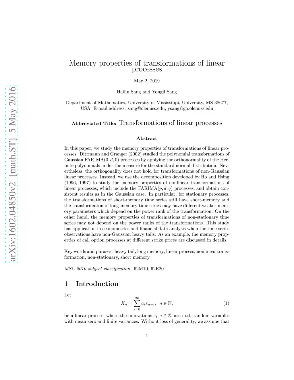 In this paper, we study the memory properties of transformations of linear processes. Dittmann and Granger (2002) studied the polynomial transformations of Gaussian FARIMA(0,d,0) processes by applying the orthonormality of the Hermite polynomials under the measure for the standard normal distribution. Nevertheless, the orthogonality does not hold for transformations of non-Gaussian linear processes. Instead, we use the decomposition developed by Ho and Hsing (1996, 1997) to study the memory properties of nonlinear transformations of linear processes, which include the FARIMA(p,d,q) processes, and obtain consistent results as in the Gaussian case. In particular, for stationary processes, the transformations of short-memory time series still have short-memory and the transformation of long-memory time series may have different weaker memory parameters which depend on the power rank of the transformation. On the other hand, the memory properties of transformations of non-stationary time series may not depend on the power ranks of the transformations. This study has application in econometrics and financial data analysis when the time series observations have non-Gaussian heavy tails. As an example, the memory properties of call option processes at different strike prices are discussed in details.