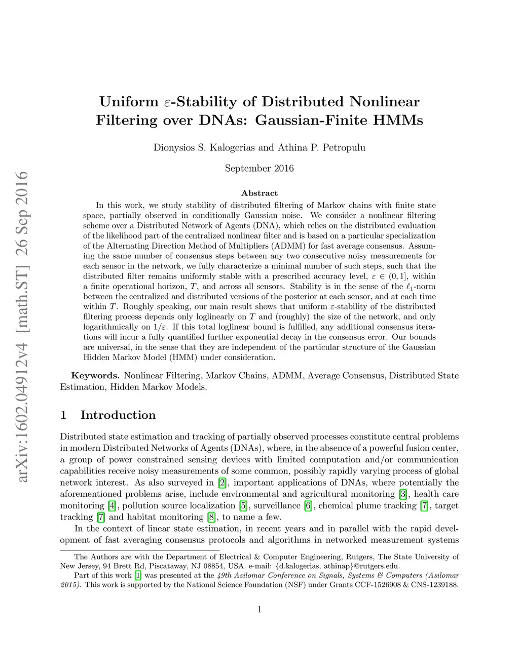In this work, we study stability of distributed filtering of Markov chains with finite state space, partially observed in conditionally Gaussian noise. We consider a nonlinear filtering scheme over a Distributed Network of Agents (DNA), which relies on the distributed evaluation of the likelihood part of the centralized nonlinear filter and is based on a particular specialization of the Alternating Direction Method of Multipliers (ADMM) for fast average consensus. Assuming the same number of consensus steps between any two consecutive noisy measurements for each sensor in the network, we fully characterize a minimal number of such steps, such that the distributed filter remains uniformly stable with a prescribed accuracy level, {\varepsilon} \in (0,1], within a finite operational horizon, T, and across all sensors. Stability is in the sense of the \ell_1-norm between the centralized and distributed versions of the posterior at each sensor, and at each time within T. Roughly speaking, our main result shows that uniform {\varepsilon}-stability of the distributed filtering process depends only loglinearly on T and (roughly) the size of the network, and only logarithmically on 1/{\varepsilon}. If this total loglinear bound is fulfilled, any additional consensus iterations will incur a fully quantified further exponential decay in the consensus error. Our bounds are universal, in the sense that they are independent of the particular structure of the Gaussian Hidden Markov Model (HMM) under consideration.