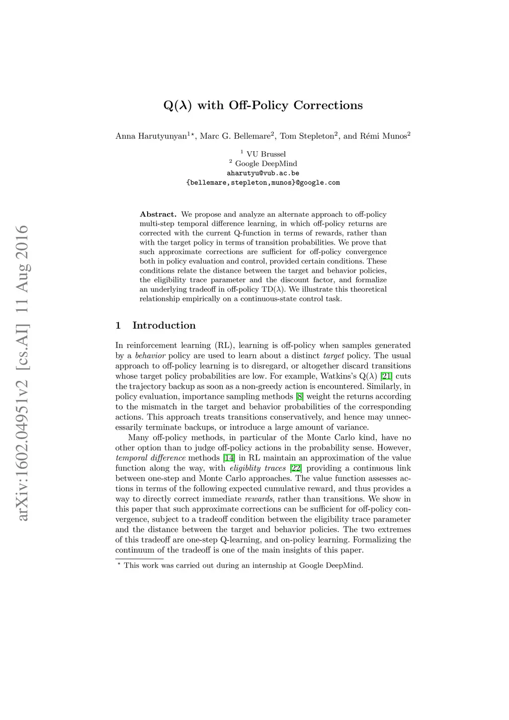 We propose and analyze an alternate approach to off-policy multi-step temporal difference learning, in which off-policy returns are corrected with the current Q-function in terms of rewards, rather than with the target policy in terms of transition probabilities. We prove that such approximate corrections are sufficient for off-policy convergence both in policy evaluation and control, provided certain conditions. These conditions relate the distance between the target and behavior policies, the eligibility trace parameter and the discount factor, and formalize an underlying tradeoff in off-policy TD(). We illustrate this theoretical relationship empirically on a continuous-state control task.