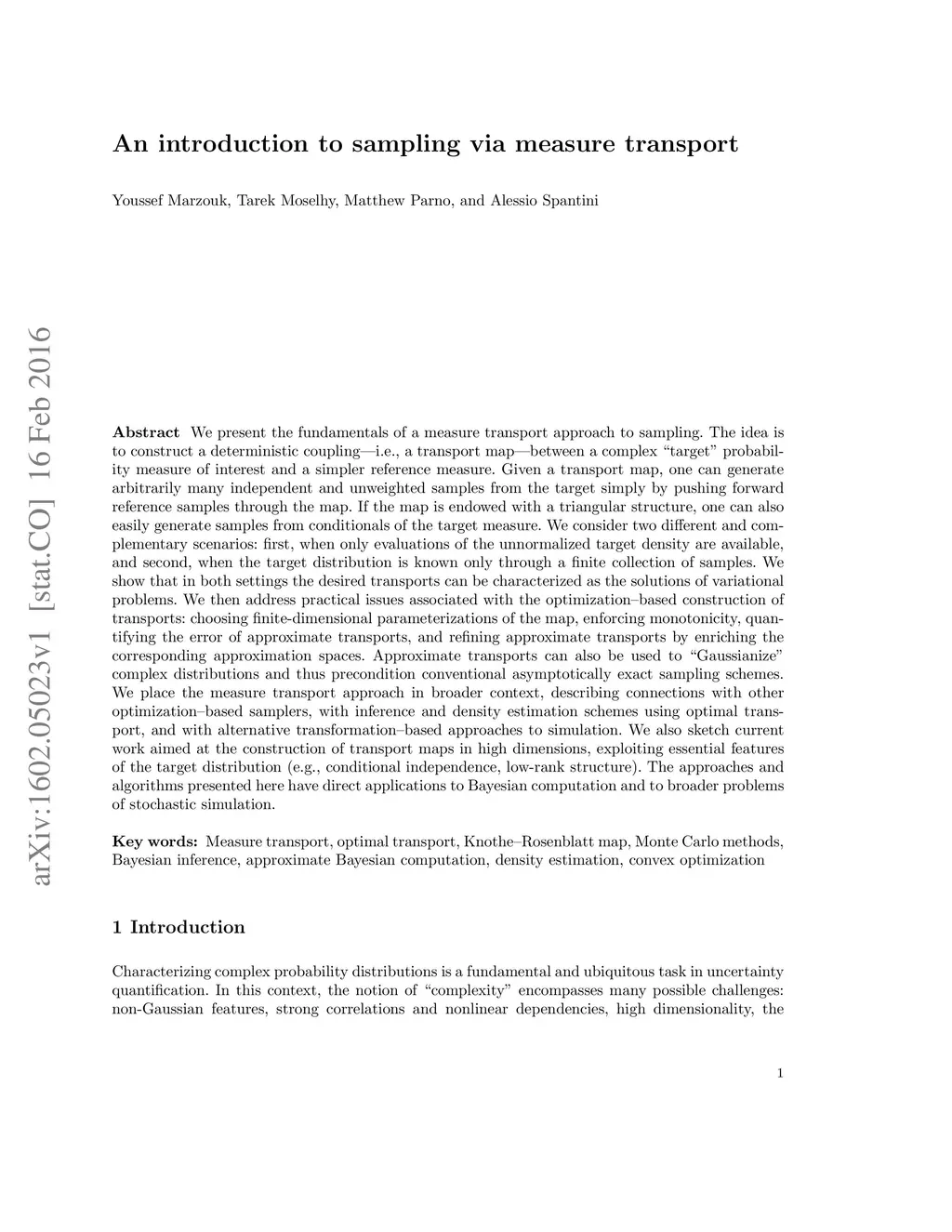 We present the fundamentals of a measure transport approach to sampling. The idea is to construct a deterministic coupling---i.e., a transport map---between a complex "target" probability measure of interest and a simpler reference measure. Given a transport map, one can generate arbitrarily many independent and unweighted samples from the target simply by pushing forward reference samples through the map. We consider two different and complementary scenarios: first, when only evaluations of the unnormalized target density are available, and second, when the target distribution is known only through a finite collection of samples. We show that in both settings the desired transports can be characterized as the solutions of variational problems. We then address practical issues associated with the optimization--based construction of transports: choosing finite-dimensional parameterizations of the map, enforcing monotonicity, quantifying the error of approximate transports, and refining approximate transports by enriching the corresponding approximation spaces. Approximate transports can also be used to "Gaussianize" complex distributions and thus precondition conventional asymptotically exact sampling schemes. We place the measure transport approach in broader context, describing connections with other optimization--based samplers, with inference and density estimation schemes using optimal transport, and with alternative transformation--based approaches to simulation. We also sketch current work aimed at the construction of transport maps in high dimensions, exploiting essential features of the target distribution (e.g., conditional independence, low-rank structure). The approaches and algorithms presented here have direct applications to Bayesian computation and to broader problems of stochastic simulation.