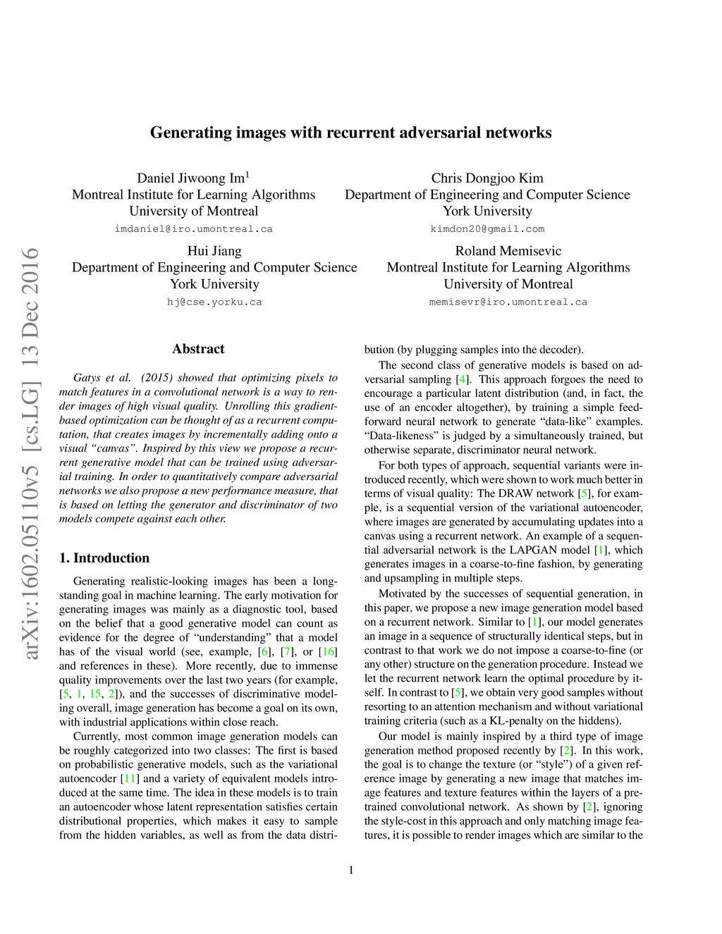 Gatys et al. (2015) showed that optimizing pixels to match features in a convolutional network with respect reference image features is a way to render images of high visual quality. We show that unrolling this gradient-based optimization yields a recurrent computation that creates images by incrementally adding onto a visual "canvas". We propose a recurrent generative model inspired by this view, and show that it can be trained using adversarial training to generate very good image samples. We also propose a way to quantitatively compare adversarial networks by having the generators and discriminators of these networks compete against each other.