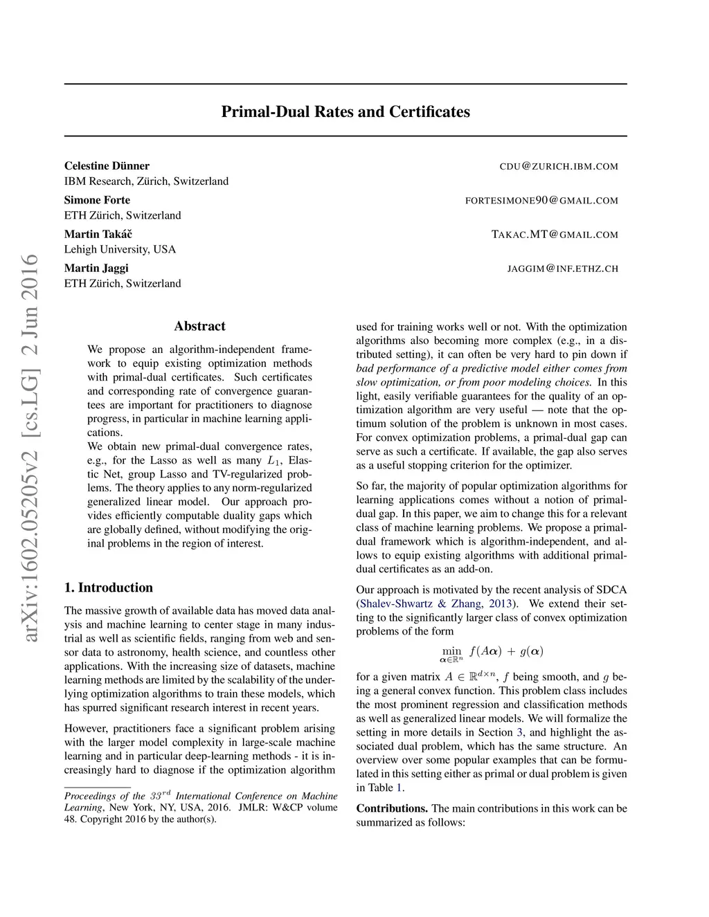 We propose an algorithm-independent framework to equip existing optimization methods with primal-dual certificates. Such certificates and corresponding rate of convergence guarantees are important for practitioners to diagnose progress, in particular in machine learning applications. We obtain new primal-dual convergence rates, e.g., for the Lasso as well as many L1, Elastic Net, group Lasso and TV-regularized problems. The theory applies to any norm-regularized generalized linear model. Our approach provides efficiently computable duality gaps which are globally defined, without modifying the original problems in the region of interest.