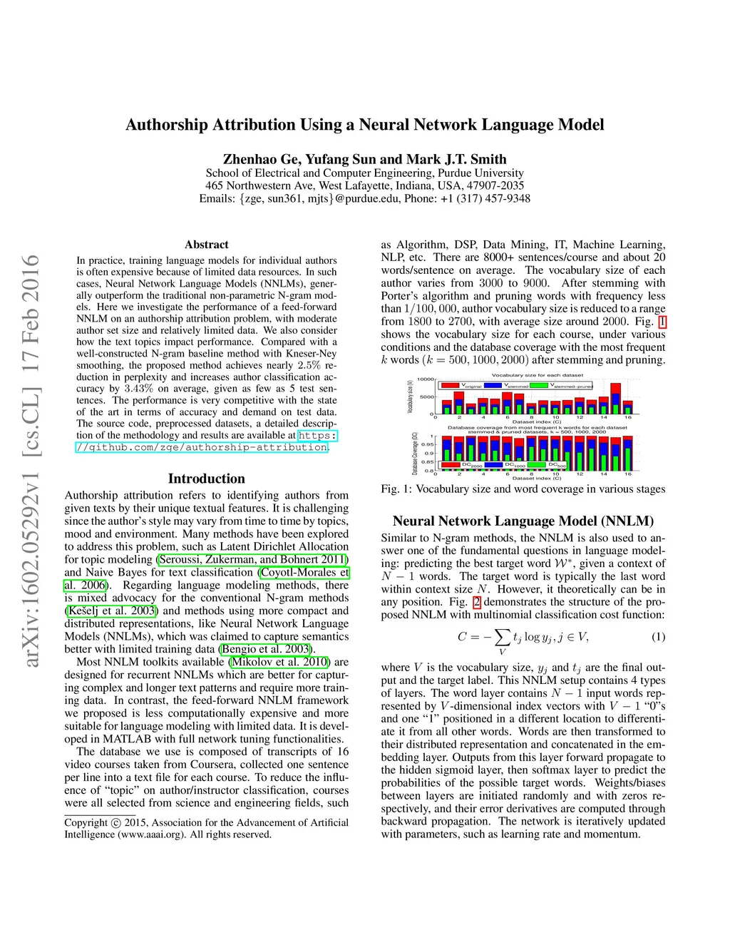 In practice, training language models for individual authors is often expensive because of limited data resources. In such cases, Neural Network Language Models (NNLMs), generally outperform the traditional non-parametric N-gram models. Here we investigate the performance of a feed-forward NNLM on an authorship attribution problem, with moderate author set size and relatively limited data. We also consider how the text topics impact performance. Compared with a well-constructed N-gram baseline method with Kneser-Ney smoothing, the proposed method achieves nearly 2:5% reduction in perplexity and increases author classification accuracy by 3:43% on average, given as few as 5 test sentences. The performance is very competitive with the state of the art in terms of accuracy and demand on test data. The source code, preprocessed datasets, a detailed description of the methodology and results are available at https://github.com/zge/authorship-attribution.