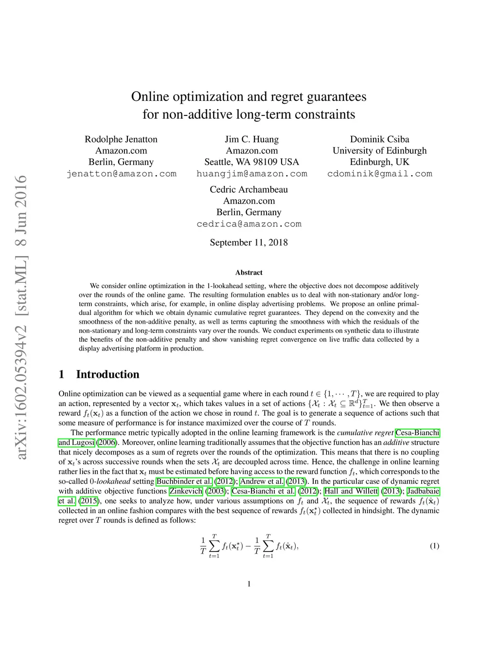We consider online optimization in the 1-lookahead setting, where the objective does not decompose additively over the rounds of the online game. The resulting formulation enables us to deal with non-stationary and/or long-term constraints , which arise, for example, in online display advertising problems. We propose an on-line primal-dual algorithm for which we obtain dynamic cumulative regret guarantees. They depend on the convexity and the smoothness of the non-additive penalty, as well as terms capturing the smoothness with which the residuals of the non-stationary and long-term constraints vary over the rounds. We conduct experiments on synthetic data to illustrate the benefits of the non-additive penalty and show vanishing regret convergence on live traffic data collected by a display advertising platform in production.