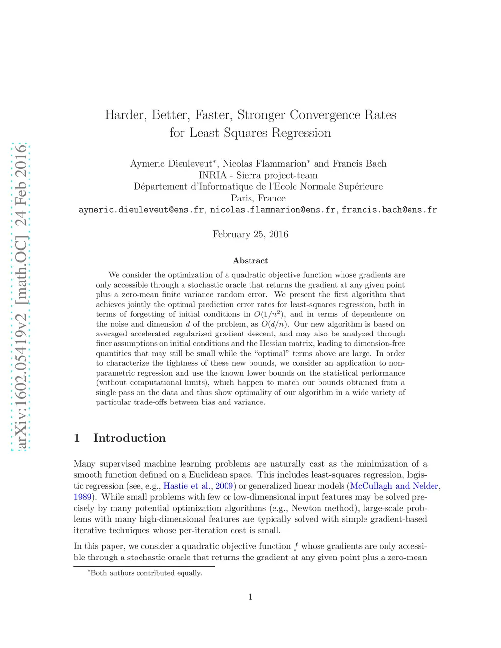 We consider the optimization of a quadratic objective function whose gradients are only accessible through a stochastic oracle that returns the gradient at any given point plus a zero-mean finite variance random error. We present the first algorithm that achieves jointly the optimal prediction error rates for least-squares regression, both in terms of forgetting of initial conditions in O(1/n 2), and in terms of dependence on the noise and dimension d of the problem, as O(d/n). Our new algorithm is based on averaged accelerated regularized gradient descent, and may also be analyzed through finer assumptions on initial conditions and the Hessian matrix, leading to dimension-free quantities that may still be small while the " optimal " terms above are large. In order to characterize the tightness of these new bounds, we consider an application to non-parametric regression and use the known lower bounds on the statistical performance (without computational limits), which happen to match our bounds obtained from a single pass on the data and thus show optimality of our algorithm in a wide variety of particular trade-offs between bias and variance.