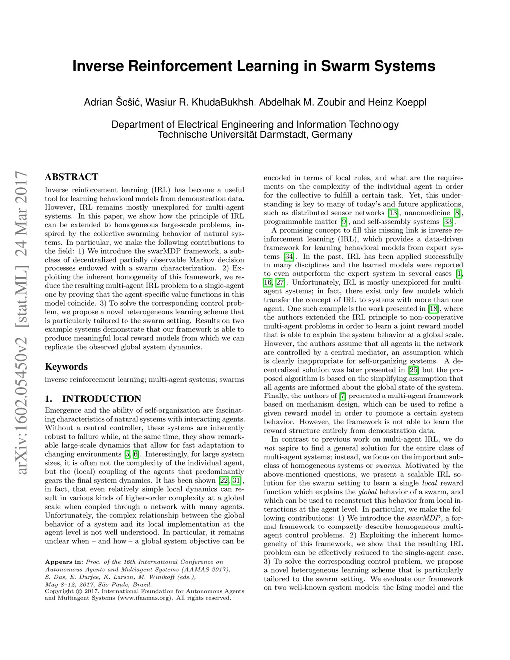 Inverse reinforcement learning (IRL) has become a useful tool for learning behavioral models from demonstration data. However, IRL remains mostly unexplored for multi-agent systems. In this paper, we show how the principle of IRL can be extended to homogeneous large-scale problems, inspired by the collective swarming behavior of natural systems. In particular, we make the following contributions to the field: 1) We introduce the swarMDP framework, a sub-class of decentralized partially observable Markov decision processes endowed with a swarm characterization. 2) Exploiting the inherent homogeneity of this framework, we reduce the resulting multi-agent IRL problem to a single-agent one by proving that the agent-specific value functions in this model coincide. 3) To solve the corresponding control problem, we propose a novel heterogeneous learning scheme that is particularly tailored to the swarm setting. Results on two example systems demonstrate that our framework is able to produce meaningful local reward models from which we can replicate the observed global system dynamics.