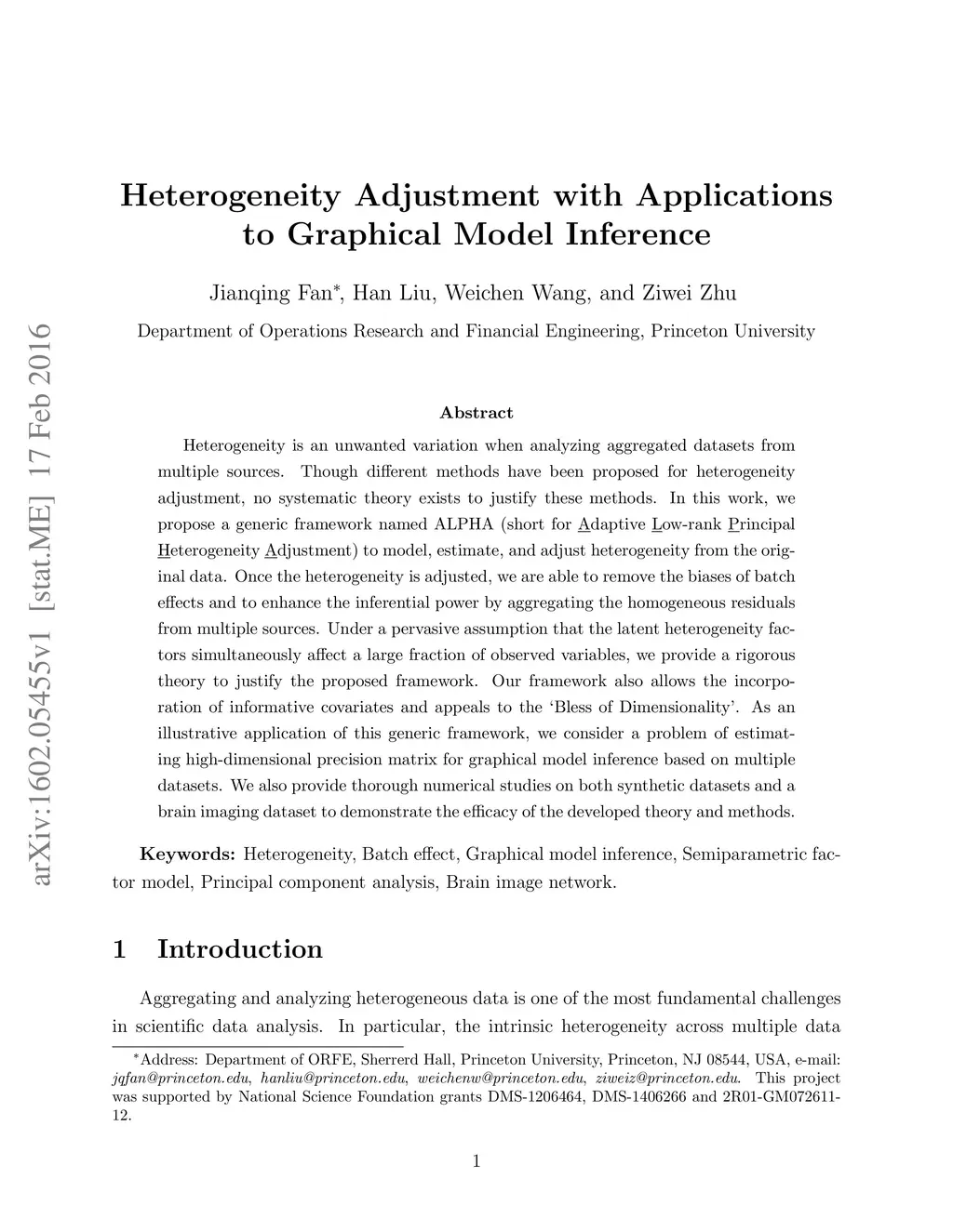 Heterogeneity is an unwanted variation when analyzing aggregated datasets from multiple sources. Though different methods have been proposed for heterogeneity adjustment, no systematic theory exists to justify these methods. In this work, we propose a generic framework named ALPHA (short for Adaptive Low-rank Principal Heterogeneity Adjustment) to model, estimate, and adjust heterogeneity from the original data. Once the heterogeneity is adjusted, we are able to remove the biases of batch effects and to enhance the inferential power by aggregating the homogeneous residuals from multiple sources. Under a pervasive assumption that the latent heterogeneity factors simultaneously affect a large fraction of observed variables, we provide a rigorous theory to justify the proposed framework. Our framework also allows the incorporation of informative covariates and appeals to the "Bless of Dimensionality". As an illustrative application of this generic framework, we consider a problem of estimating high-dimensional precision matrix for graphical model inference based on multiple datasets. We also provide thorough numerical studies on both synthetic datasets and a brain imaging dataset to demonstrate the efficacy of the developed theory and methods.