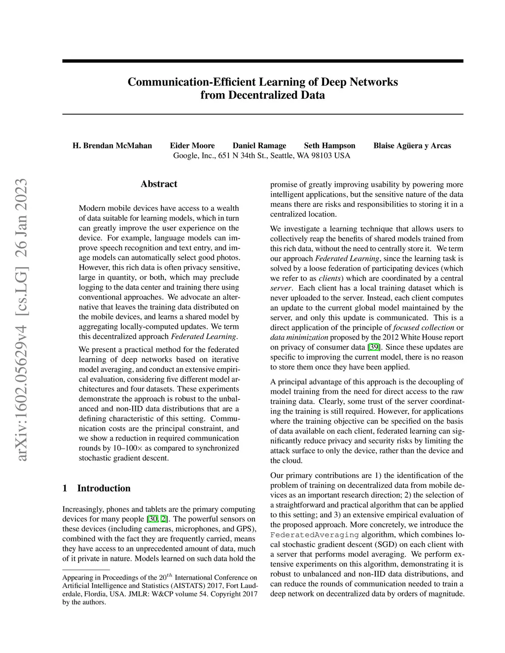 Modern mobile devices have access to a wealth of data suitable for learning models, which in turn can greatly improve the user experience on the device. For example, language models can improve speech recognition and text entry, and image models can automatically select good photos. However, this rich data is often privacy sensitive, large in quantity, or both, which may preclude logging to the data center and training there using conventional approaches. We advocate an alternative that leaves the training data distributed on the mobile devices, and learns a shared model by aggregating locally-computed updates. We term this decentralized approach Federated Learning. We present a practical method for the federated learning of deep networks based on iterative model averaging, and conduct an extensive empirical evaluation, considering five different model architectures and four datasets. These experiments demonstrate the approach is robust to the unbalanced and non-IID data distributions that are a defining characteristic of this setting. Communication costs are the principal constraint, and we show a reduction in required communication rounds by 10-100x as compared to synchronized stochastic gradient descent.