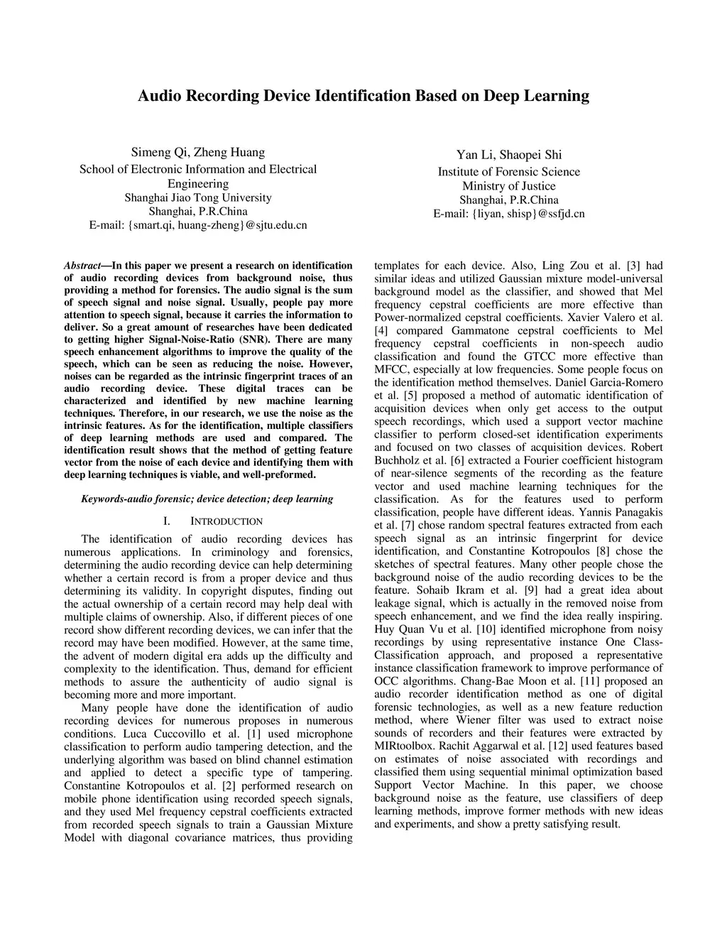 In this paper we present a research on identification of audio recording devices from background noise, thus providing a method for forensics. The audio signal is the sum of speech signal and noise signal. Usually, people pay more attention to speech signal, because it carries the information to deliver. So a great amount of researches have been dedicated to getting higher Signal-Noise-Ratio (SNR). There are many speech enhancement algorithms to improve the quality of the speech, which can be seen as reducing the noise. However, noises can be regarded as the intrinsic fingerprint traces of an audio recording device. These digital traces can be characterized and identified by new machine learning techniques. Therefore, in our research, we use the noise as the intrinsic features. As for the identification, multiple classifiers of deep learning methods are used and compared. The identification result shows that the method of getting feature vector from the noise of each device and identifying them with deep learning techniques is viable, and well-preformed.