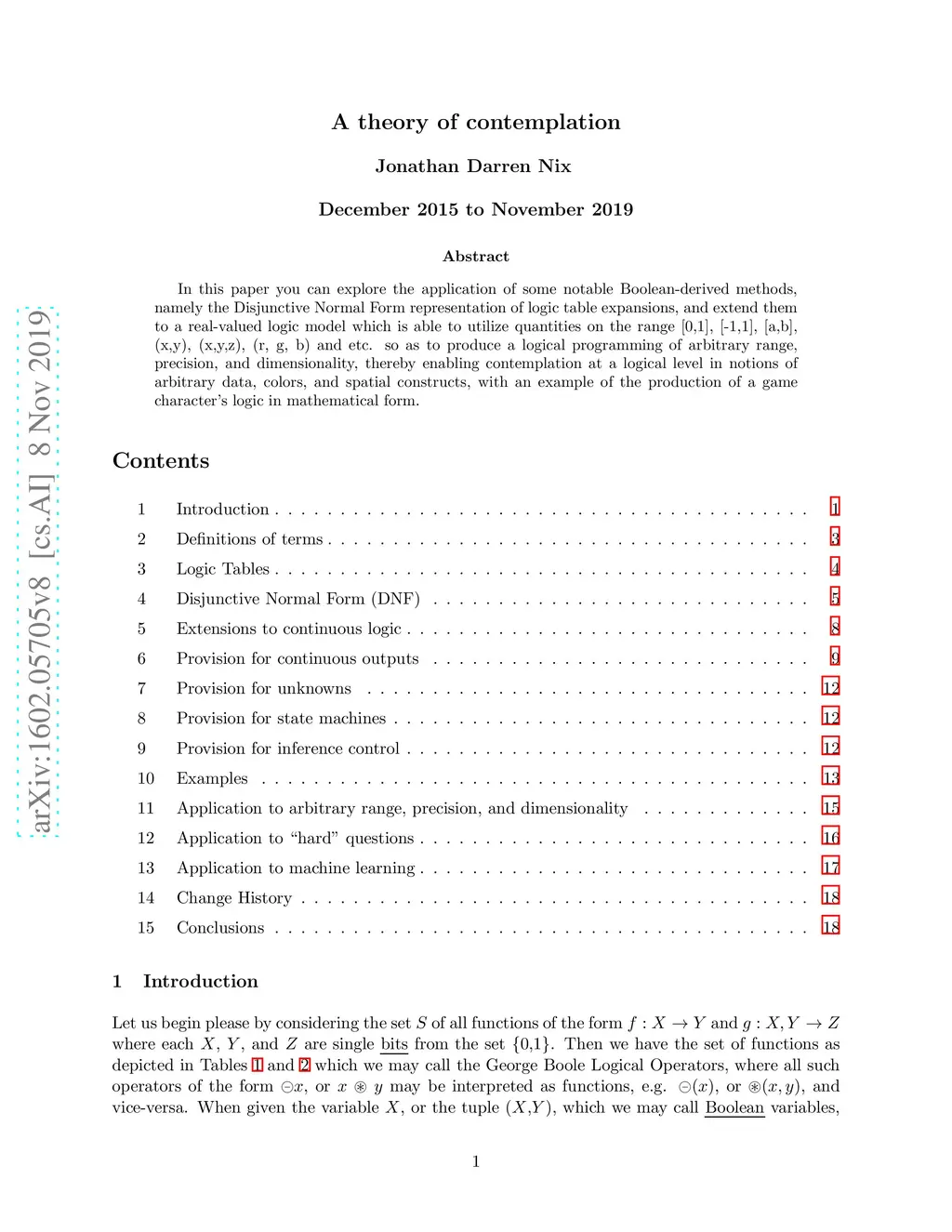In this paper you can explore the application of some notable Boolean-derived methods, namely the Disjunctive Normal Form representation of logic table expansions, and extend them to a real-valued logic model which is able to utilize quantities on the range [0,1], [-1,1], [a,b], (x,y), (x,y,z), and etc. so as to produce a logical programming of arbitrary range, precision, and dimensionality, thereby enabling contemplation at a logical level in notions of arbitrary data, colors, and spatial constructs, with an example of the production of a game character's logic in mathematical form.