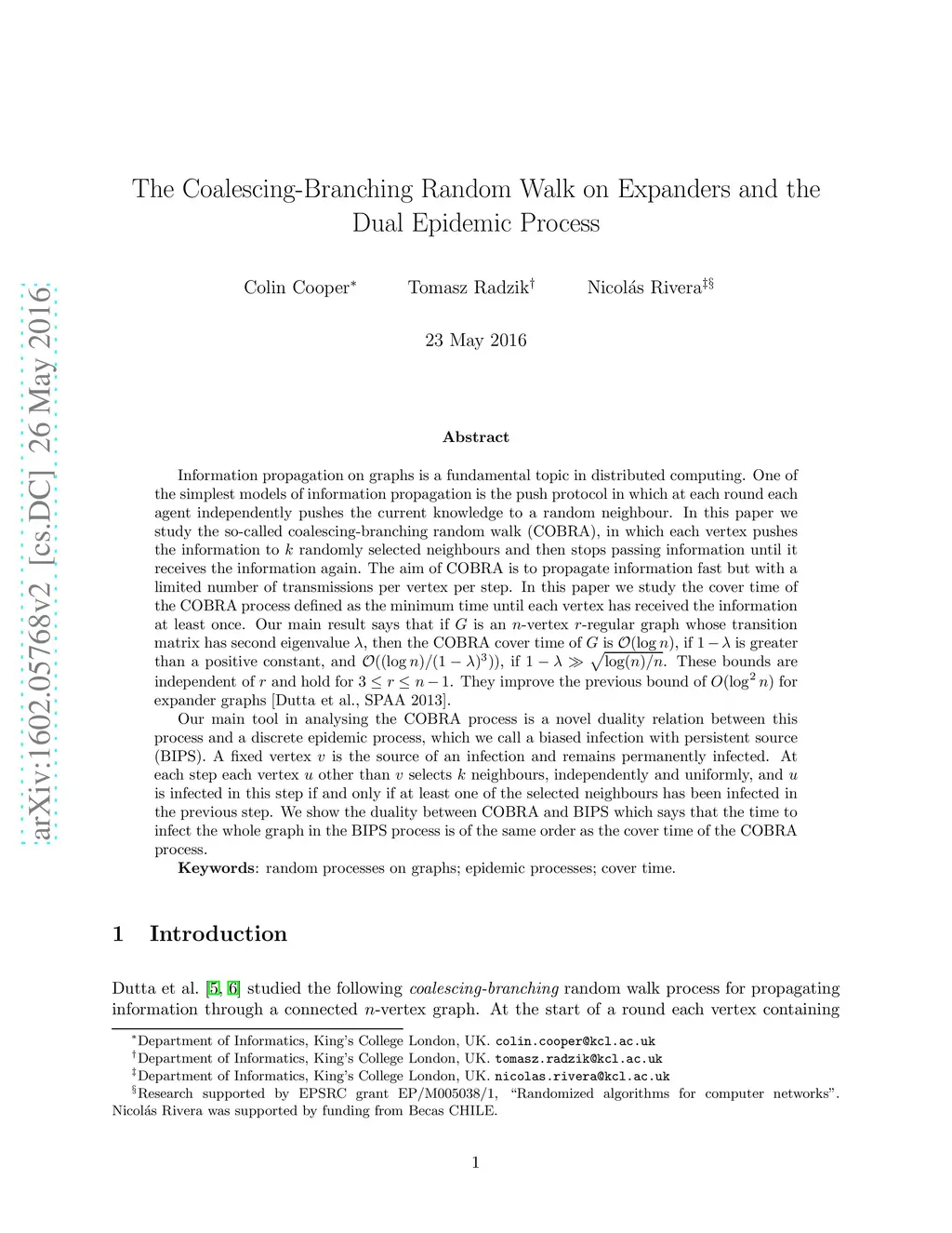 Information propagation on graphs is a fundamental topic in distributed computing. One of the simplest models of information propagation is the push protocol in which at each round each agent independently pushes the current knowledge to a random neighbour. In this paper we study the so-called coalescing-branching random walk (COBRA), in which each vertex pushes the information to randomly selected neighbours and then stops passing information until it receives the information again. The aim of COBRA is to propagate information fast but with a limited number of transmissions per vertex per step. In this paper we study the cover time of the COBRA process defined as the minimum time until each vertex has received the information at least once. Our main result says that if is an -vertex -regular graph whose transition matrix has second eigenvalue , then the COBRA cover time of is , if is greater than a positive constant, and , if . These bounds are independent of and hold for . They improve the previous bound of for expander graphs. Our main tool in analysing the COBRA process is a novel duality relation between this process and a discrete epidemic process, which we call a biased infection with persistent source (BIPS). A fixed vertex is the source of an infection and remains permanently infected. At each step each vertex other than selects neighbours, independently and uniformly, and is infected in this step if and only if at least one of the selected neighbours has been infected in the previous step. We show the duality between COBRA and BIPS which says that the time to infect the whole graph in the BIPS process is of the same order as the cover time of the COBRA process