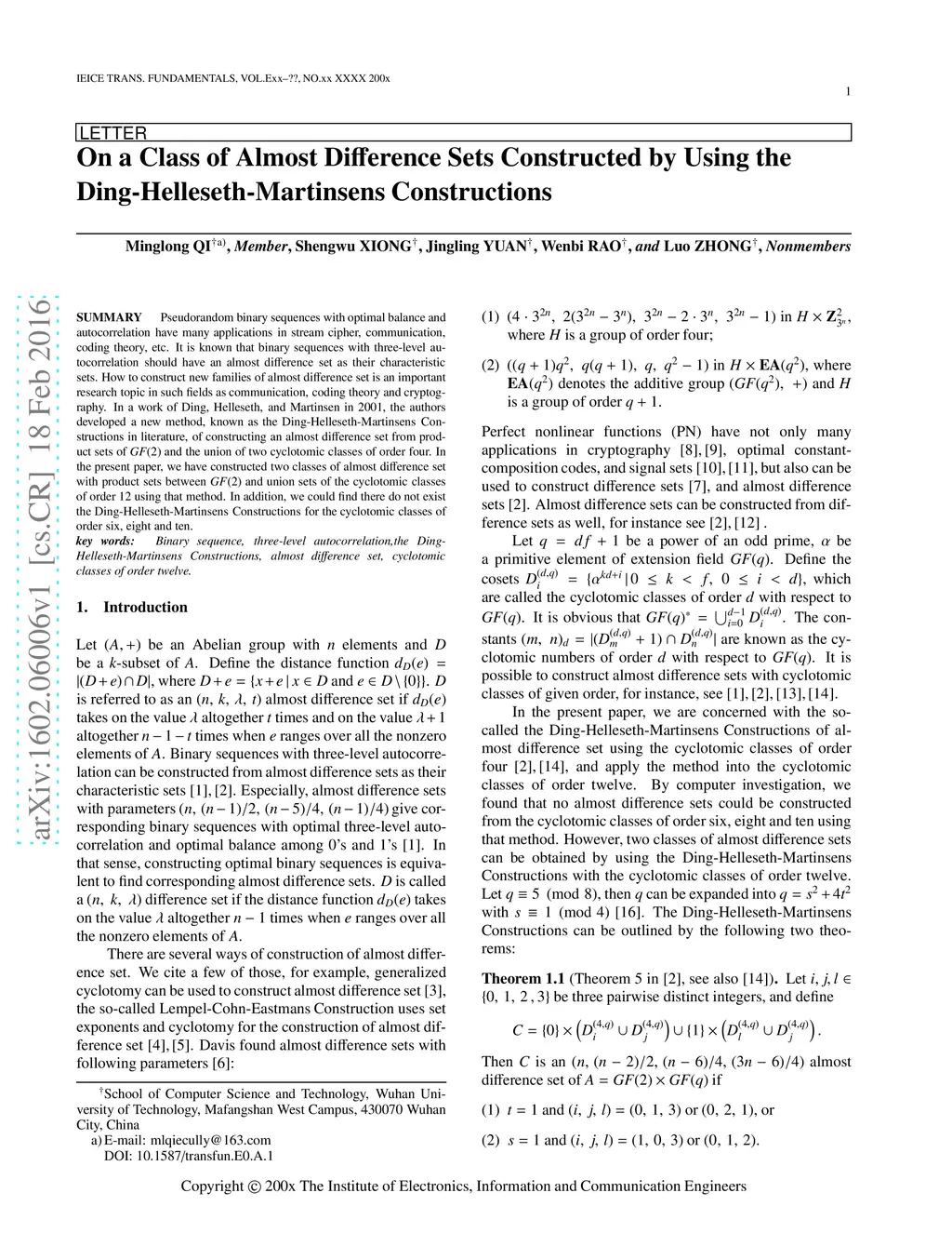 Pseudorandom binary sequences with optimal balance and autocorrelation have many applications in stream cipher, communication, coding theory, etc. It is known that binary sequences with three-level autocorrelation should have an almost difference set as their characteristic sets. How to construct new families of almost difference set is an important research topic in such fields as communication, coding theory and cryptography. In a work of Ding, Helleseth, and Martinsen in 2001, the authors developed a new method, known as the Ding-Helleseth-Martinsens Constructions in literature, of constructing an almost difference set from product sets of GF(2) and the union of two cyclotomic classes of order four. In the present paper, we have constructed two classes of almost difference set with product sets between GF(2) and union sets of the cyclotomic classes of order 12 using that method. In addition, we could find there do not exist the Ding-Helleseth-Martinsens Constructions for the cyclotomic classes of order six and eight.