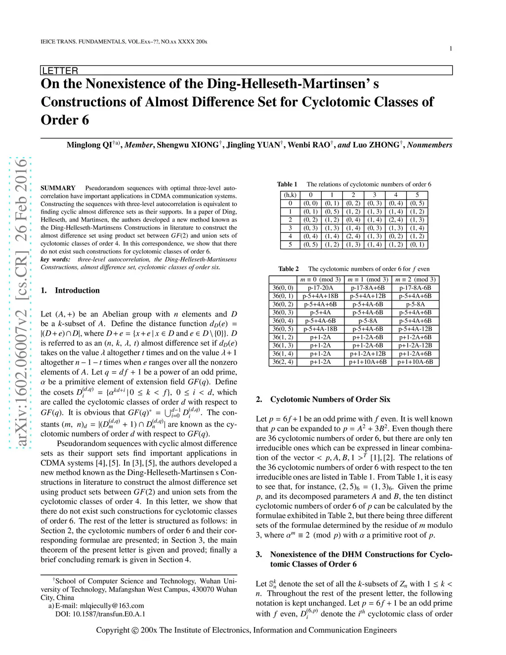 Pseudorandom sequences with optimal three-level autocorrelation have important applications in CDMA communication systems. Constructing the sequences with three-level autocorrelation is equivalent to finding cyclic almost difference sets as their supports. In a paper of Ding, Helleseth, and Martinsen, the authors developed a new method known as the Ding-Helleseth-Martinsens Constructions in literature to construct the almost difference set using product set between GF(2) and union sets of cyclotomic classes of order 4. In this correspondence, we show that there do not exist such constructions for cyclotomic classes of order 6.