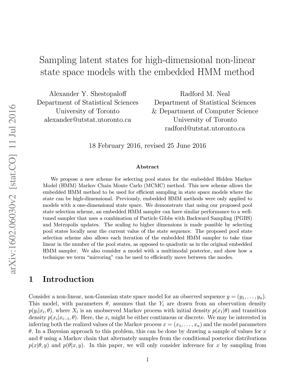 We propose a new scheme for selecting pool states for the embedded Hidden Markov Model (HMM) Markov Chain Monte Carlo (MCMC) method. This new scheme allows the embedded HMM method to be used for efficient sampling in state space models where the state can be high-dimensional. Previously, embedded HMM methods were only applied to models with a one-dimensional state space. We demonstrate that using our proposed pool state selection scheme, an embedded HMM sampler can have similar performance to a well-tuned sampler that uses a combination of Particle Gibbs with Backward Sampling (PGBS) and Metropolis updates. The scaling to higher dimensions is made possible by selecting pool states locally near the current value of the state sequence. The proposed pool state selection scheme also allows each iteration of the embedded HMM sampler to take time linear in the number of the pool states, as opposed to quadratic as in the original embedded HMM sampler. We also consider a model with a multimodal posterior, and show how a technique we term "mirroring" can be used to efficiently move between the modes. We show that the embedded HMM sampler with mirroring performs significantly better for this multimodal example than a sampler combining PGBS and Metropolis updates.