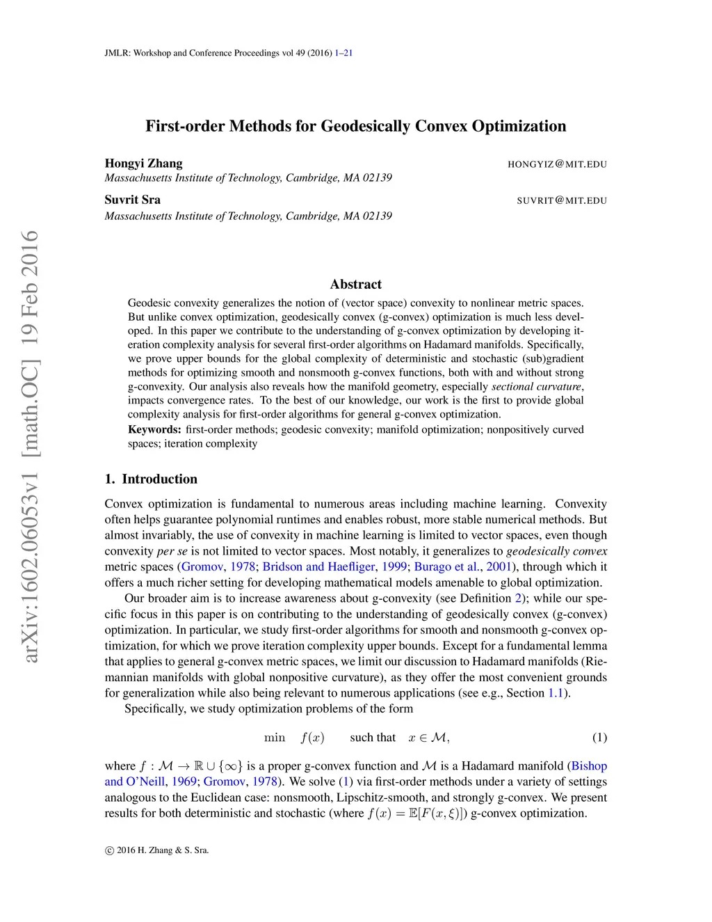 Geodesic convexity generalizes the notion of (vector space) convexity to nonlinear metric spaces. But unlike convex optimization, geodesically convex (g-convex) optimization is much less developed. In this paper we contribute to the understanding of g-convex optimization by developing iteration complexity analysis for several first-order algorithms on Hadamard manifolds. Specifically, we prove upper bounds for the global complexity of deterministic and stochastic (sub)gradient methods for optimizing smooth and nonsmooth g-convex functions, both with and without strong g-convexity. Our analysis also reveals how the manifold geometry, especially \emph{sectional curvature}, impacts convergence rates. To the best of our knowledge, our work is the first to provide global complexity analysis for first-order algorithms for general g-convex optimization.