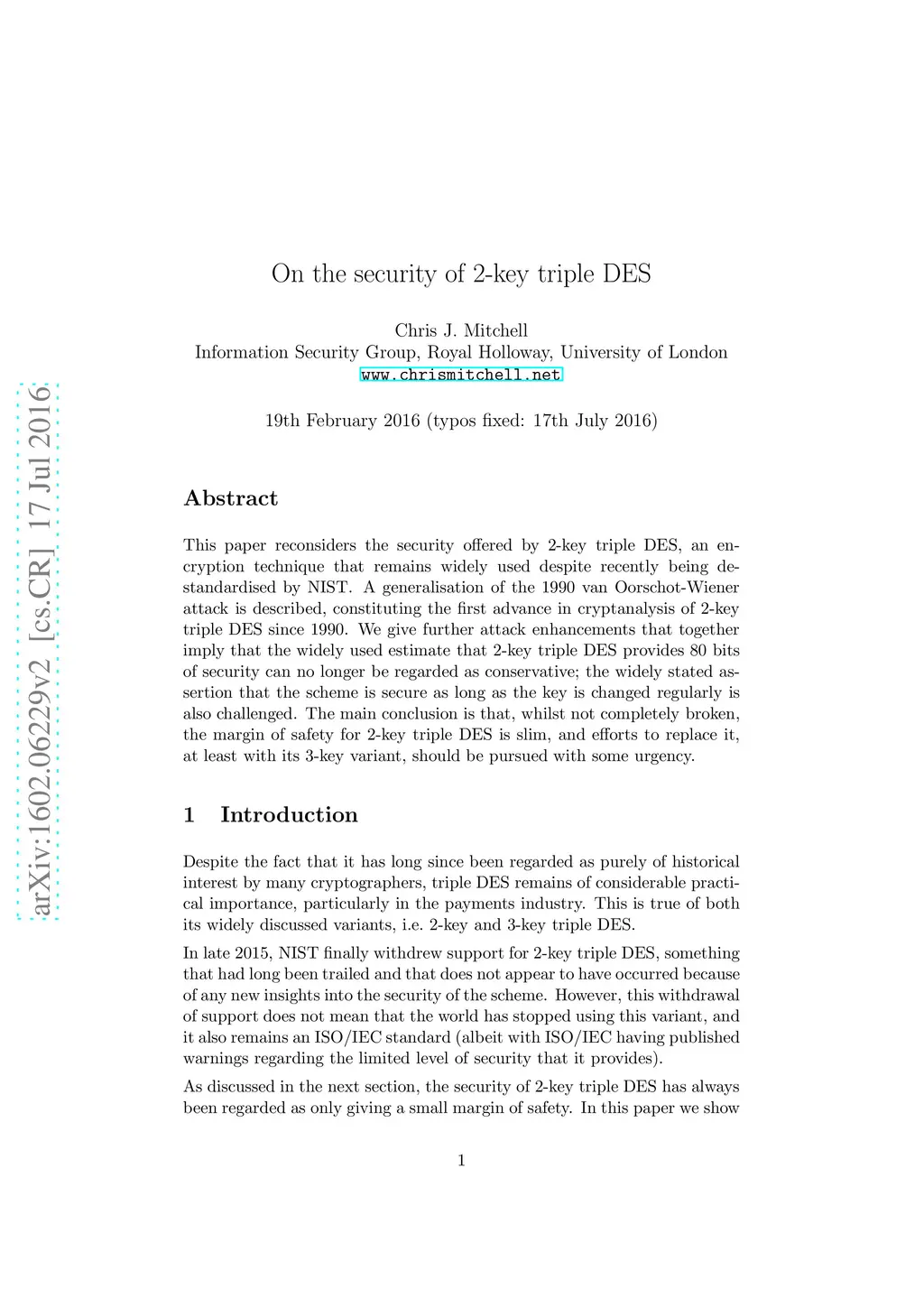 This paper reconsiders the security offered by 2-key triple DES, an encryption technique that remains widely used despite recently being de-standardised by NIST. A generalisation of the 1990 van Oorschot-Wiener attack is described, constituting the first advance in cryptanalysis of 2-key triple DES since 1990. We give further attack enhancements that together imply that the widely used estimate that 2-key triple DES provides 80 bits of security can no longer be regarded as conservative; the widely stated assertion that the scheme is secure as long as the key is changed regularly is also challenged. The main conclusion is that, whilst not completely broken, the margin of safety for 2-key triple DES is slim, and efforts to replace it, at least with its 3-key variant, should be pursued with some urgency.