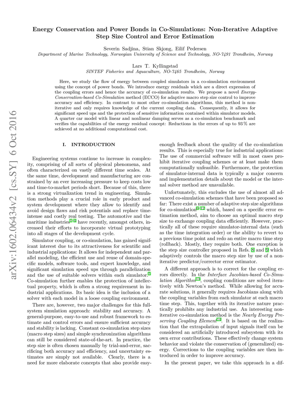 Here, we study the flow of energy between coupled simulators in a co-simulation environment using the concept of power bonds. We introduce energy residuals which are a direct expression of the coupling errors and hence the accuracy of co-simulation results. We propose a novel Energy-Conservation-based Co-Simulation method (ECCO) for adaptive macro step size control to improve accuracy and efficiency. In contrast to most other co-simulation algorithms, this method is non-iterative and only requires knowledge of the current coupling data. Consequently, it allows for significant speed ups and the protection of sensitive information contained within simulator models. A quarter car model with linear and nonlinear damping serves as a co-simulation benchmark and verifies the capabilities of the energy residual concept: Reductions in the errors of up to 93% are achieved at no additional computational cost.