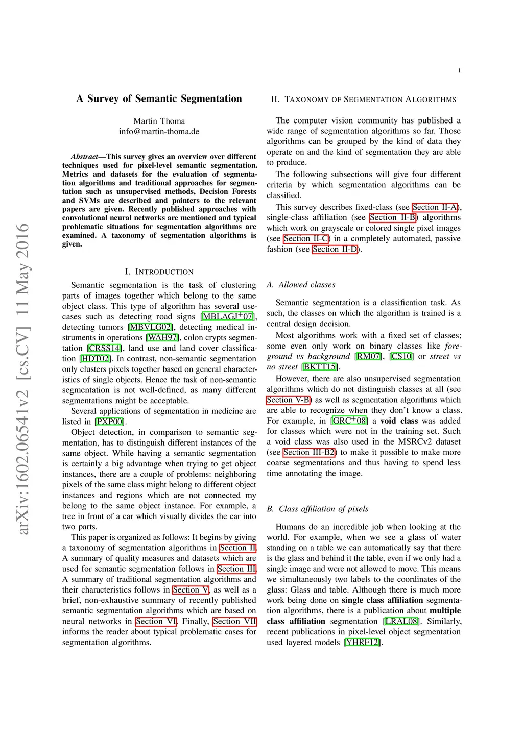 This survey gives an overview over different techniques used for pixel-level semantic segmentation. Metrics and datasets for the evaluation of segmentation algorithms and traditional approaches for segmentation such as unsupervised methods, Decision Forests and SVMs are described and pointers to the relevant papers are given. Recently published approaches with convolutional neural networks are mentioned and typical problematic situations for segmentation algorithms are examined. A taxonomy of segmentation algorithms is given.