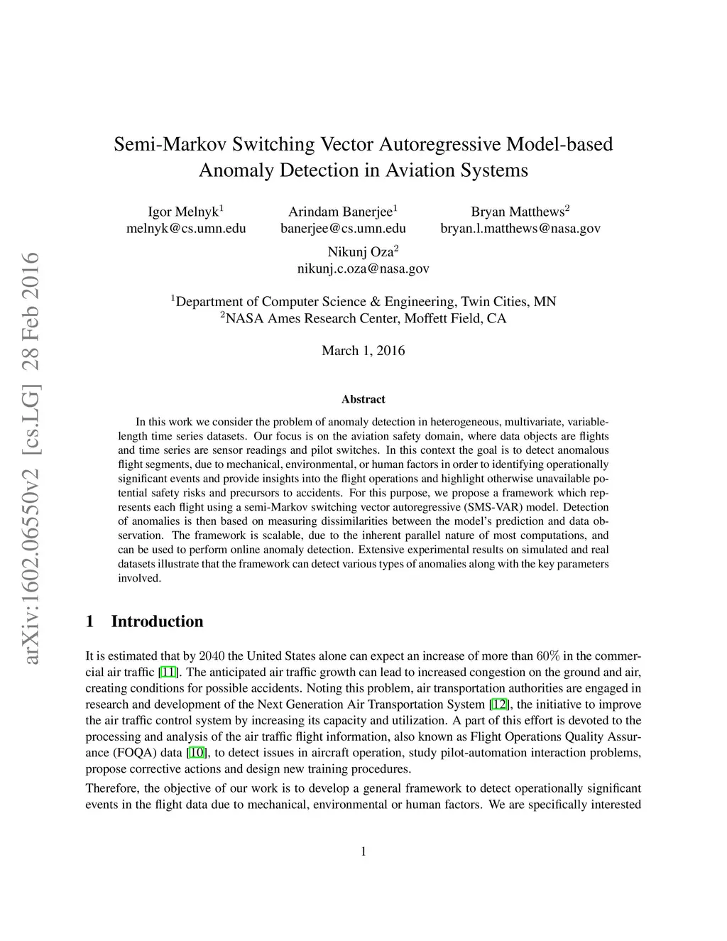 In this work we consider the problem of anomaly detection in heterogeneous, multivariate, variable-length time series datasets. Our focus is on the aviation safety domain, where data objects are flights and time series are sensor readings and pilot switches. In this context the goal is to detect anomalous flight segments, due to mechanical, environmental, or human factors in order to identifying operationally significant events and provide insights into the flight operations and highlight otherwise unavailable potential safety risks and precursors to accidents. For this purpose, we propose a framework which represents each flight using a semi-Markov switching vector autoregressive (SMS-VAR) model. Detection of anomalies is then based on measuring dissimilarities between the model's prediction and data observation. The framework is scalable, due to the inherent parallel nature of most computations, and can be used to perform online anomaly detection. Extensive experimental results on simulated and real datasets illustrate that the framework can detect various types of anomalies along with the key parameters involved.