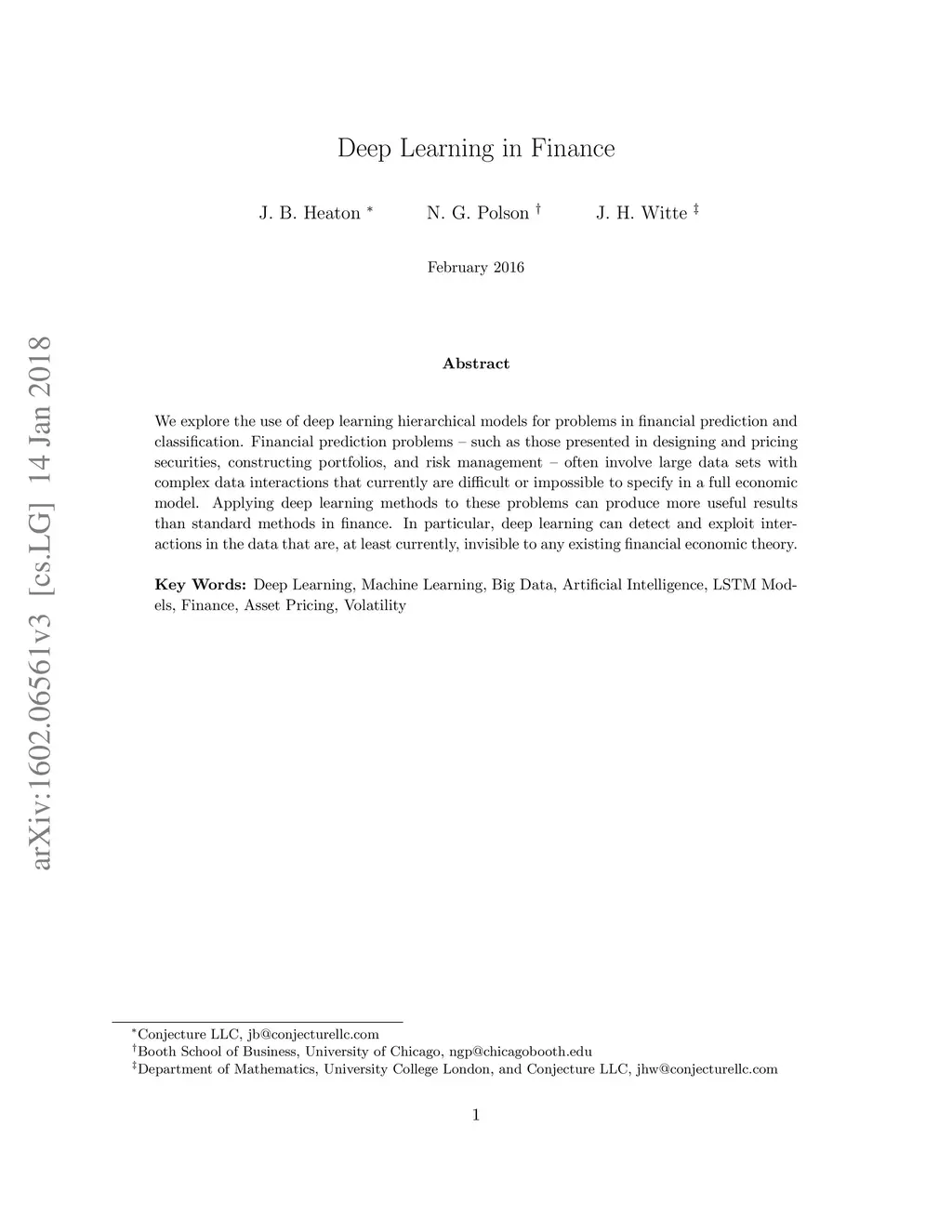 We explore the use of deep learning hierarchical models for problems in financial prediction and classification. Financial prediction problems -- such as those presented in designing and pricing securities, constructing portfolios, and risk management -- often involve large data sets with complex data interactions that currently are difficult or impossible to specify in a full economic model. Applying deep learning methods to these problems can produce more useful results than standard methods in finance. In particular, deep learning can detect and exploit interactions in the data that are, at least currently, invisible to any existing financial economic theory.