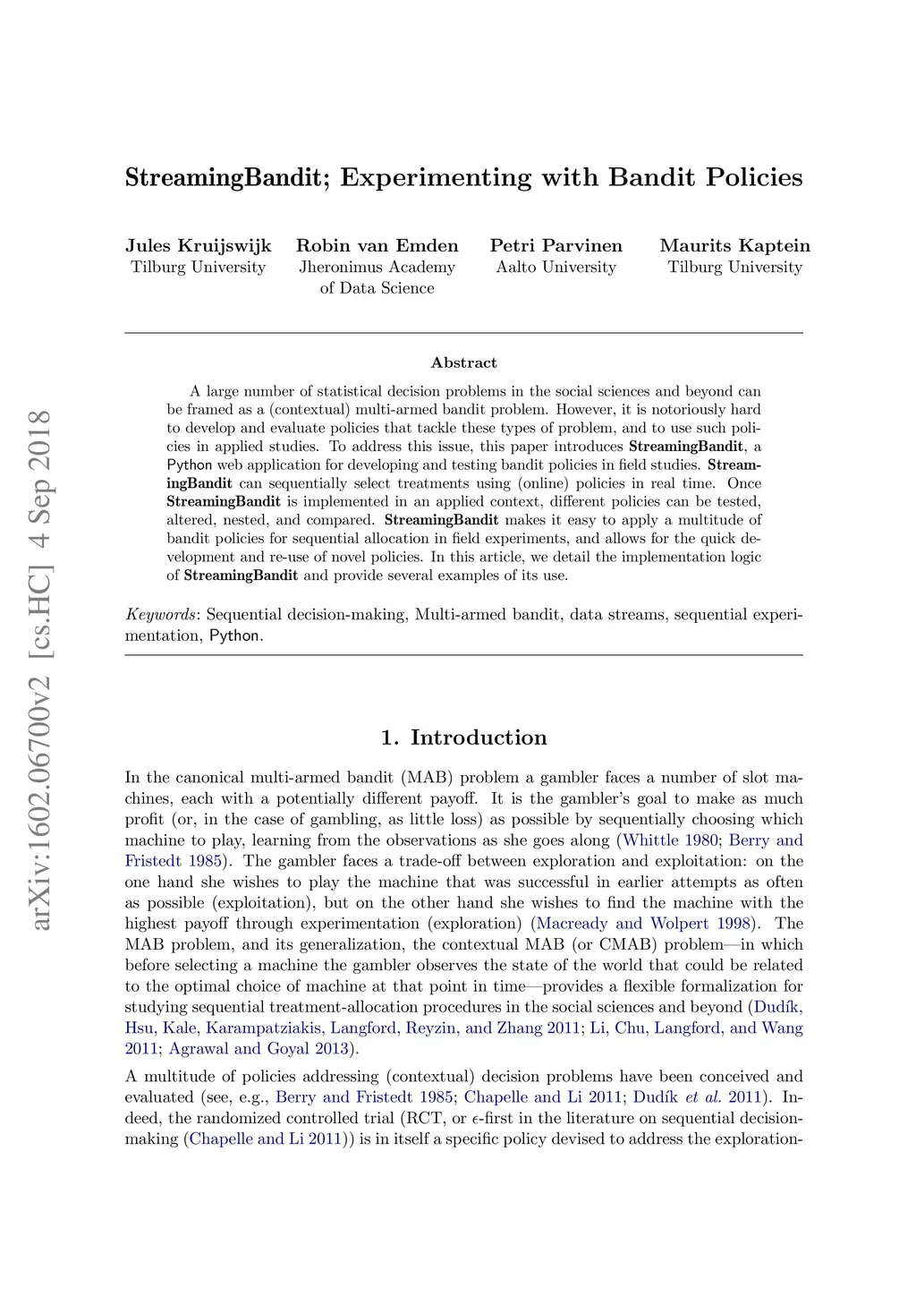A large number of statistical decision problems in the social sciences and beyond can be framed as a (contextual) multi-armed bandit problem. However, it is notoriously hard to develop and evaluate policies that tackle these types of problem, and to use such policies in applied studies. To address this issue, this paper introduces StreamingBandit, a Python web application for developing and testing bandit policies in field studies. StreamingBandit can sequentially select treatments using (online) policies in real time. Once StreamingBandit is implemented in an applied context, different policies can be tested, altered, nested, and compared. StreamingBandit makes it easy to apply a multitude of bandit policies for sequential allocation in field experiments, and allows for the quick development and re-use of novel policies. In this article, we detail the implementation logic of StreamingBandit and provide several examples of its use.