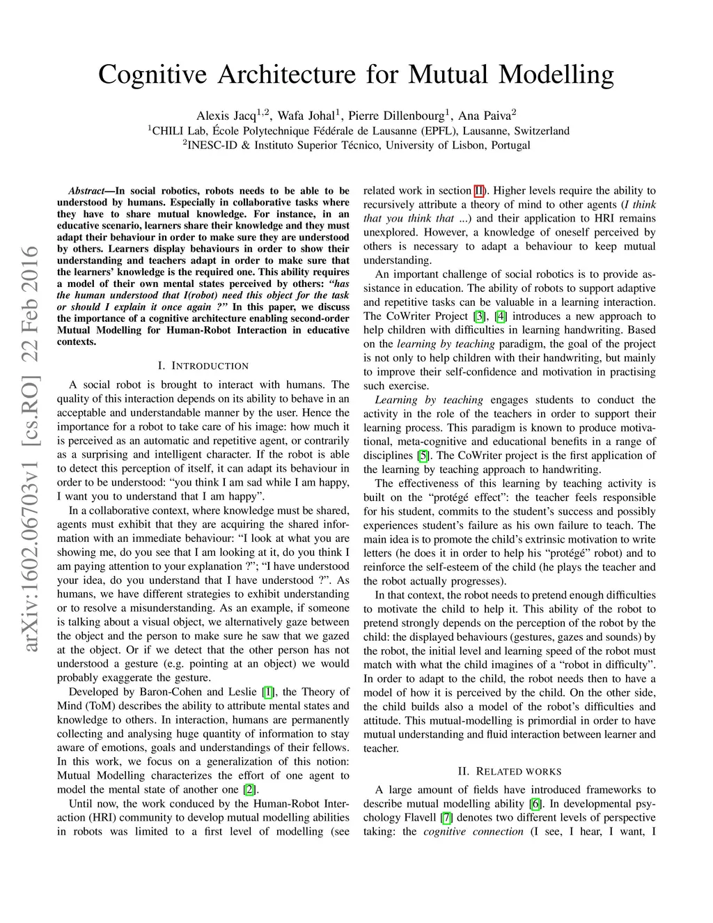 In social robotics, robots needs to be able to be understood by humans. Especially in collaborative tasks where they have to share mutual knowledge. For instance, in an educative scenario, learners share their knowledge and they must adapt their behaviour in order to make sure they are understood by others. Learners display behaviours in order to show their understanding and teachers adapt in order to make sure that the learners' knowledge is the required one. This ability requires a model of their own mental states perceived by others: \textit{"has the human understood that I(robot) need this object for the task or should I explain it once again ?"} In this paper, we discuss the importance of a cognitive architecture enabling second-order Mutual Modelling for Human-Robot Interaction in educative contexts.