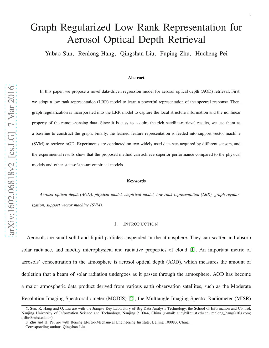 Graph Regularized Low Rank Representation for Aerosol Optical Depth