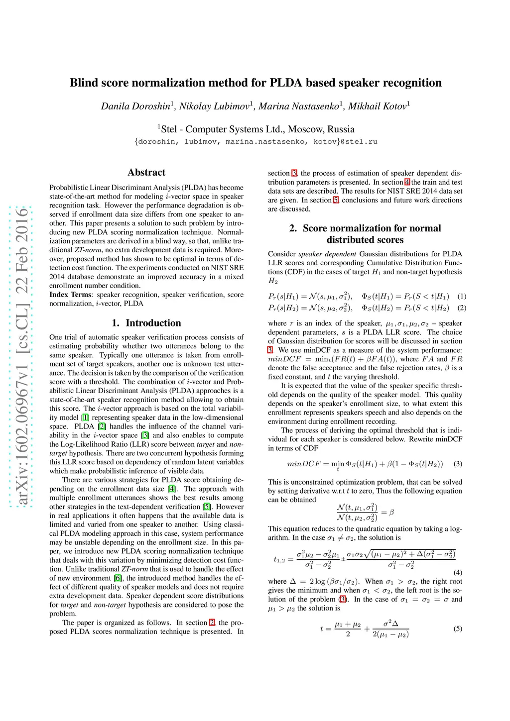 Probabilistic Linear Discriminant Analysis (PLDA) has become state-of-the-art method for modeling -vector space in speaker recognition task. However the performance degradation is observed if enrollment data size differs from one speaker to another. This paper presents a solution to such problem by introducing new PLDA scoring normalization technique. Normalization parameters are derived in a blind way, so that, unlike traditional \textit{ZT-norm}, no extra development data is required. Moreover, proposed method has shown to be optimal in terms of detection cost function. The experiments conducted on NIST SRE 2014 database demonstrate an improved accuracy in a mixed enrollment number condition.